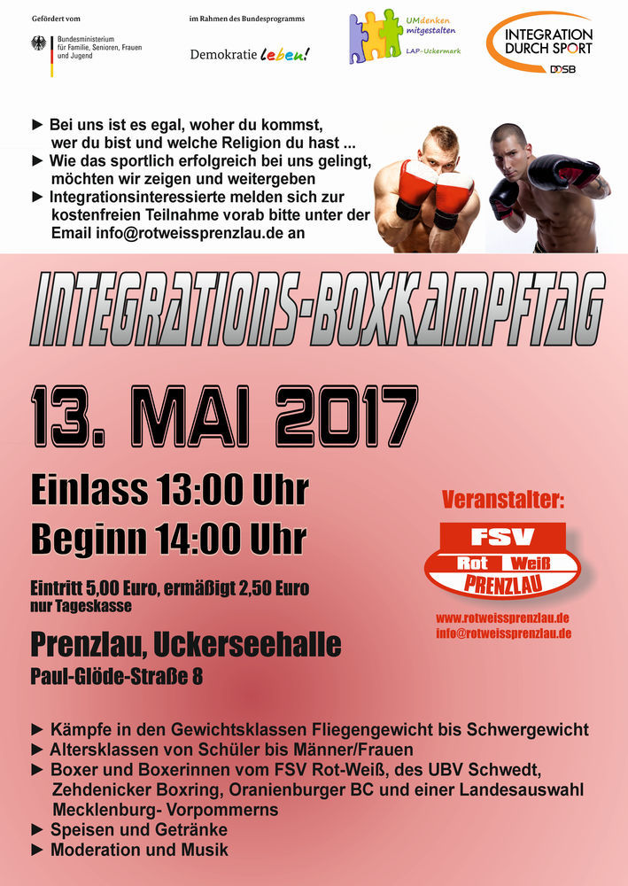 Es ist so weit - nach langer Durststrecke ist der Boxkampf wieder in Prenzlau angekommen. Wir laden am 13. Mai zum Integrations-Box- kampftag in die Uckerseehalle Prenzlau ein. Einlass ist ab 13:00 Uhr, die Kämpfe beginnen um 14:00 Uhr und Ende wird voraussichtlich gegen 18:00 Uhr sein. Der Eintritt beträgt 5,00 Euro, ermäßigt 2,50 Euro und ist an der Tageskasse zu entrichten.