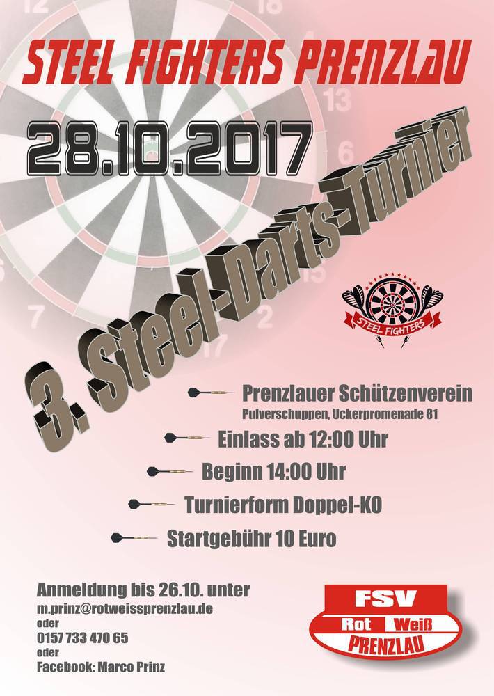 Am Sonnabend, dem 28.10.2017, laden die Steel Fighters zum 3. Steel-Darts-Turnier ein. Das Turnier findet diesmal im Pulverschuppen des Prenzlauer Schützenvereins statt. In diesen Räumlichkeiten wird übrigens seit September auch das Training der Darter durchgeführt.