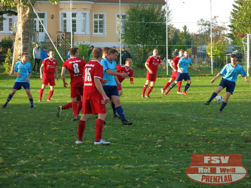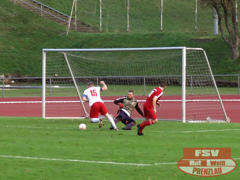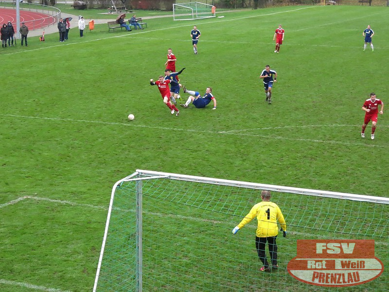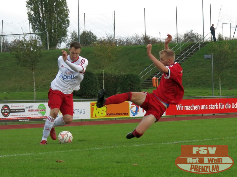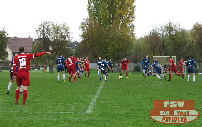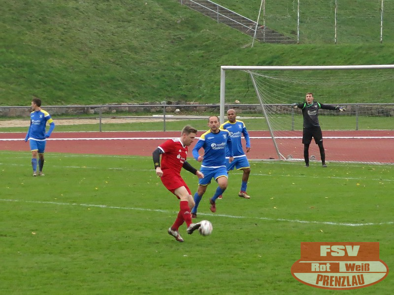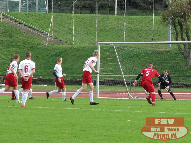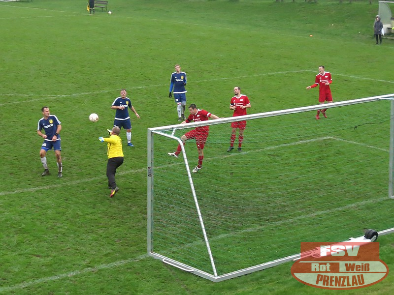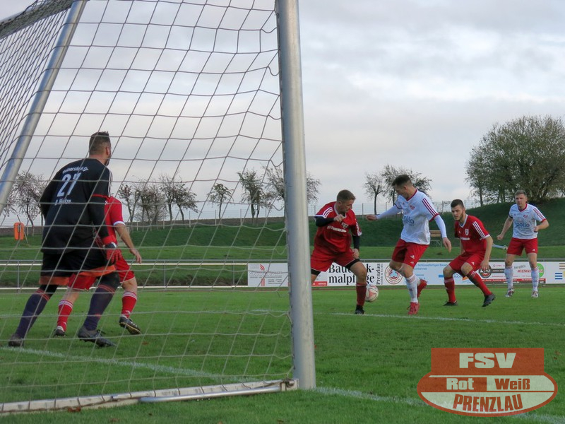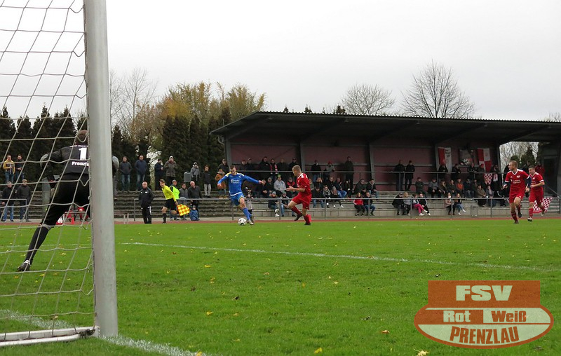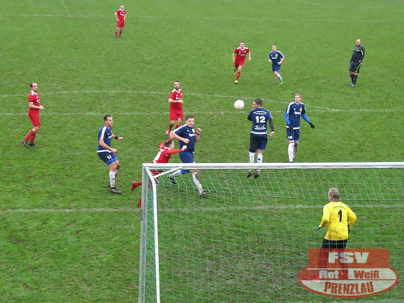 Die zweite Halbzeit begann ähnlich wie die erste. Templin, offensichtlich mit dem Ziel eine schnelle Vorentscheidung herbeizuführen, erst einmal im Vorwärtsgang. Die Rot-Weißen hielten aber dagegen und konnten das Spiel dann relativ ausgeglichen gestalten. Der Zug zum gegnerischen Tor blieb auf beiden Seiten relativ überschaubar. Doch dann kam die 67. Minute und das Desaster begann. Einen kompletten Aussetzer der Prenzlauer Hintermannschaft inklusive Torhüter nutzte der sicher noch bei vielen bekannte Robert Sikorski zur erneuten Templiner Führung. Dieser Gegentreffer bewirkte einen regelrechten Bruch im Spiel der Heimmannschaft. Man hatte den Eindruck, die Abwehr spielte jetzt nicht mehr den Pokalhit, sondern den Tango Dilettanti. Häufig wurde den Templiner Angreifern bei ihrer Arbeit und dem Ball bei seinem Weg durch den Strafraum nur staunend hinterher gesehen. Klärungsversuche misslangen zu oft und wurden dem Gegner postwendend in die Beine gespielt. Der Gast aus Templin brauchte nur noch auf die Fehler der Heimelf zu lauern und nutzte diese locker zu weiteren drei Treffern. Zwei davon überflüssigerweise in den letzten beiden Spielminuten. Zum Glück pfiff der Schiedsrichter die Begegnung pünktlich ab, denn die rot-weiße Abwehrarbeit strahlte schon einen leichten Hauch von Peinlichkeit aus.