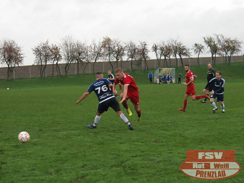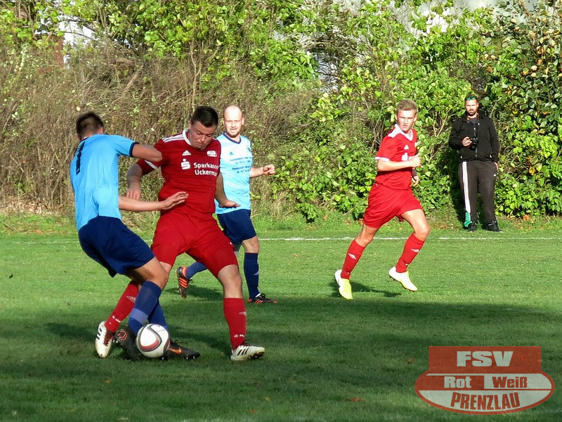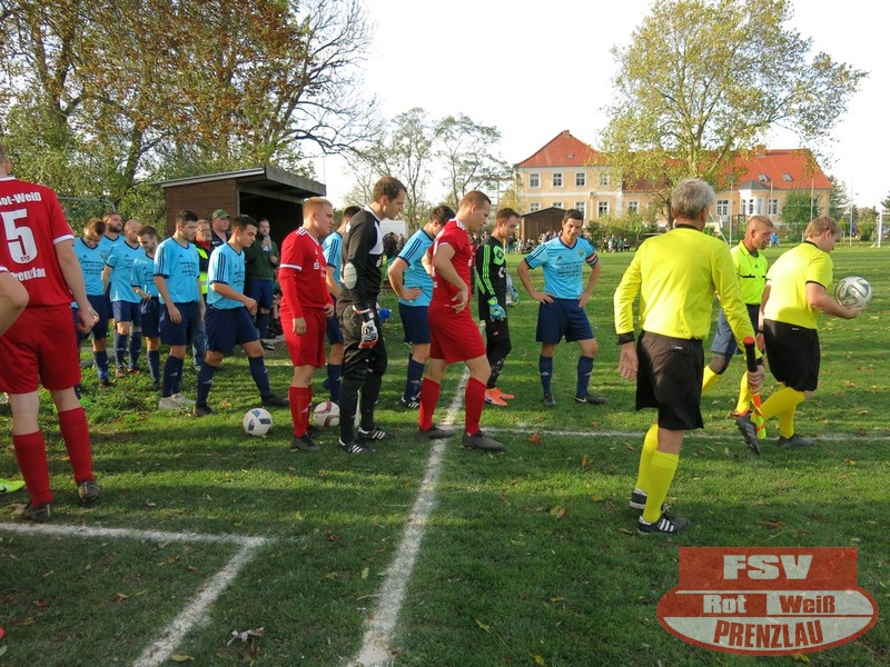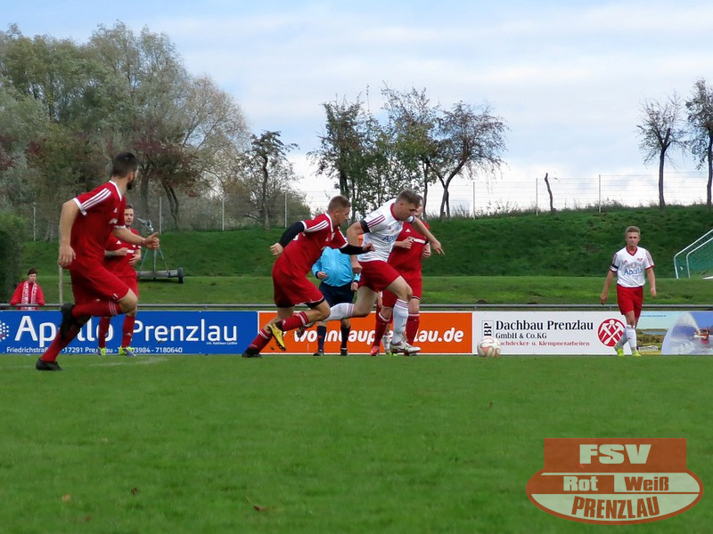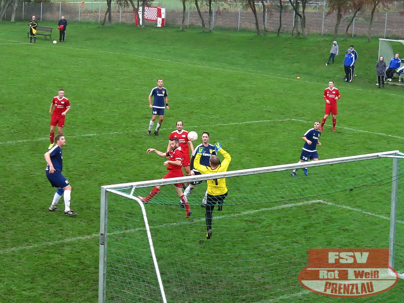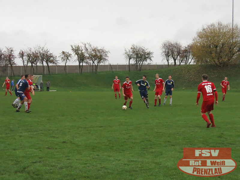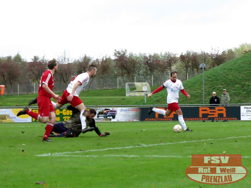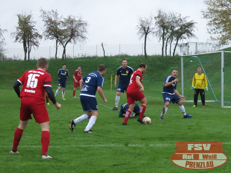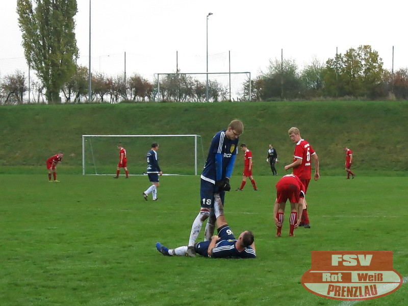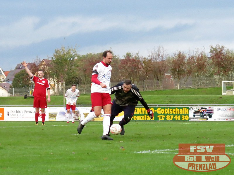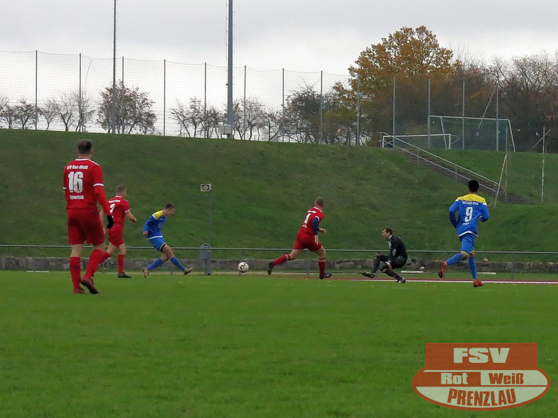 Die zweite Halbzeit begann ähnlich wie die erste. Templin, offensichtlich mit dem Ziel eine schnelle Vorentscheidung herbeizuführen, erst einmal im Vorwärtsgang. Die Rot-Weißen hielten aber dagegen und konnten das Spiel dann relativ ausgeglichen gestalten. Der Zug zum gegnerischen Tor blieb auf beiden Seiten relativ überschaubar. Doch dann kam die 67. Minute und das Desaster begann. Einen kompletten Aussetzer der Prenzlauer Hintermannschaft inklusive Torhüter nutzte der sicher noch bei vielen bekannte Robert Sikorski zur erneuten Templiner Führung. Dieser Gegentreffer bewirkte einen regelrechten Bruch im Spiel der Heimmannschaft. Man hatte den Eindruck, die Abwehr spielte jetzt nicht mehr den Pokalhit, sondern den Tango Dilettanti. Häufig wurde den Templiner Angreifern bei ihrer Arbeit und dem Ball bei seinem Weg durch den Strafraum nur staunend hinterher gesehen. Klärungsversuche misslangen zu oft und wurden dem Gegner postwendend in die Beine gespielt. Der Gast aus Templin brauchte nur noch auf die Fehler der Heimelf zu lauern und nutzte diese locker zu weiteren drei Treffern. Zwei davon überflüssigerweise in den letzten beiden Spielminuten. Zum Glück pfiff der Schiedsrichter die Begegnung pünktlich ab, denn die rot-weiße Abwehrarbeit strahlte schon einen leichten Hauch von Peinlichkeit aus.