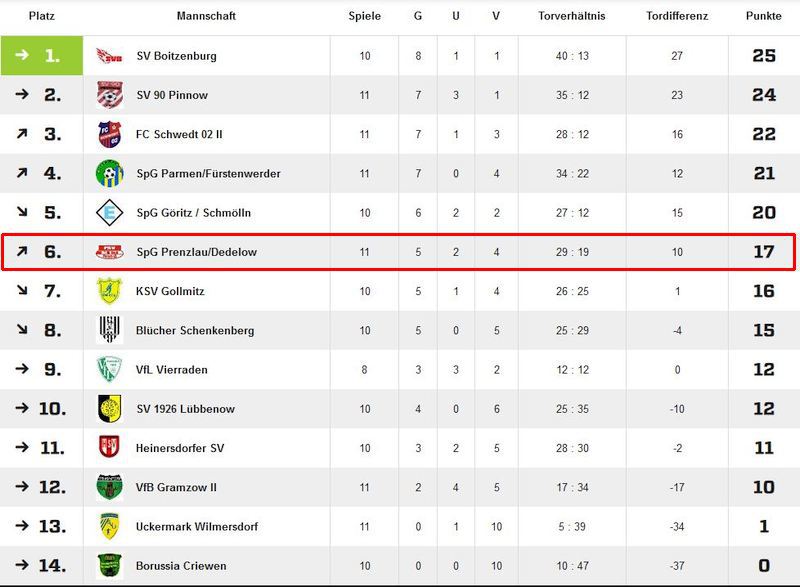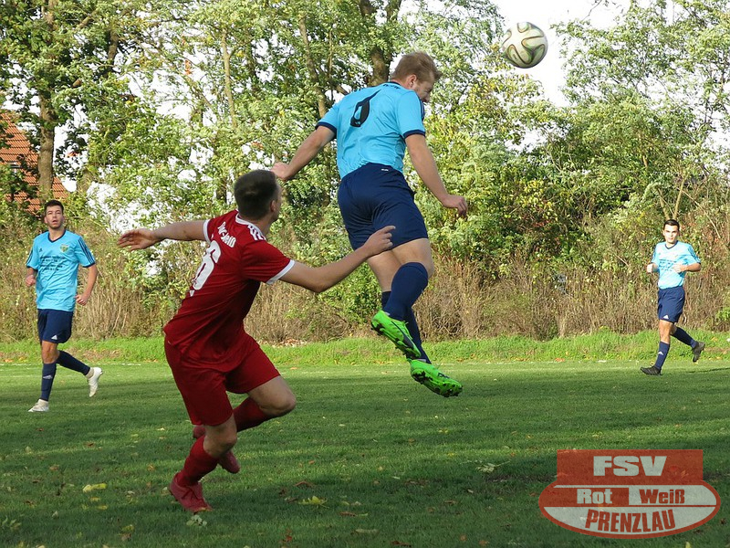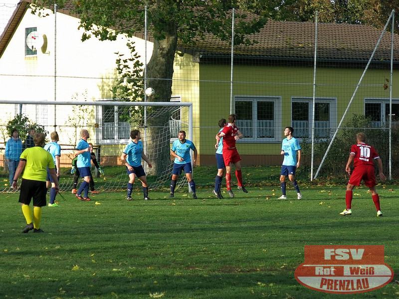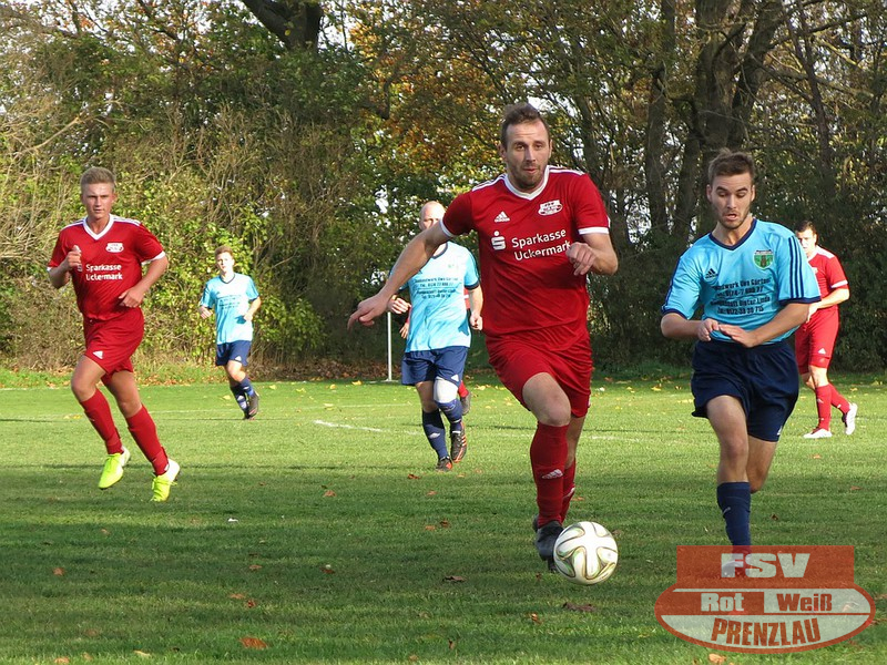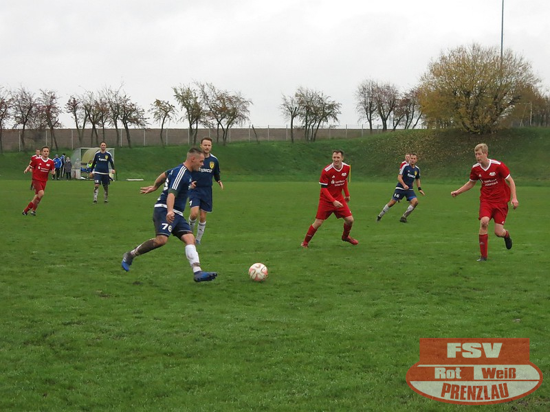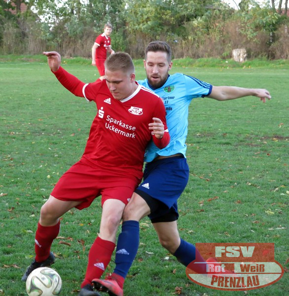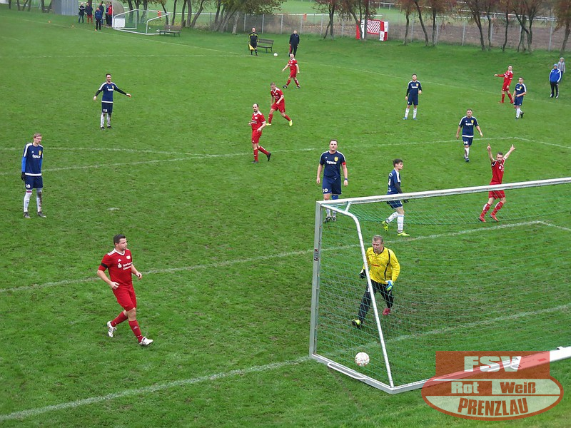 Gestern trafen mit dem VfB Gramzow II und der SpG Prenzlau/Dedelow die beiden Aufsteiger in der Kreisoberliga aufeinander. Beide dümpeln momentan mehr im unteren Teil der Tabelle umher und bräuchten eigentlich dringend mal wieder drei Punkte auf ihrem Konto. Gramzow bis dato zu Hause allerdings noch ungeschlagen, unsere SpG auswärts bisher sieglos. Diese Konstellation sollte sich gleich zu Beginn fast bestätigen. Es waren noch keine drei Minuten gespielt, da ließ der Prenzlauer Keeper einen eigentlich harmlosen Ball direkt vor die Füße eines Gramzower Spielers fallen. Der hätte nur noch in das leere Tor einschieben müssen, doch der Ball flog glücklicherweise hoch über das Tor hinweg. Das war dann aber auch die beste, um nicht zu sagen einzige Chance für den Gastgeber in Hälfte eins. Im gesamten Spielverlauf war Gramzow zwar die aktivere Mannschaft, aber zu erfolgversprechenden Abschlüssen kam es höchst selten. Die Rot-Weißen zogen sich überwiegend in die eigene Hälfte zurück und lauerten auf Konter. Und die Gelegenheiten für schnelle Vorstöße über beide Außen und den kaum zu haltenden Markus Müller in der Mitte boten sich immer wieder. So kam es dann, dass Gramzow das Spiel machte und unsere SpG die Tore. Dabei sorgten Jeromé Schulz von rechts flach ins lange Eck, Markus Müller zentral aus fünf Metern mit sattem Schuss in die Maschen und noch einmal Markus, freundlich von sieben Gegenspielern im Strafraum beobachtet, mit platziertem Kopfball für die beruhigende 3:0 Halbzeitführung.