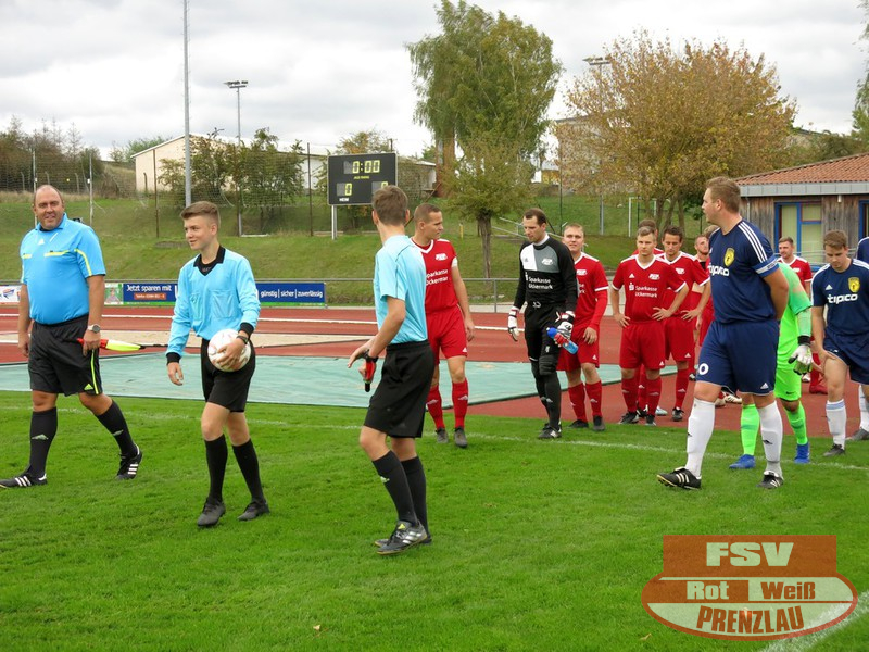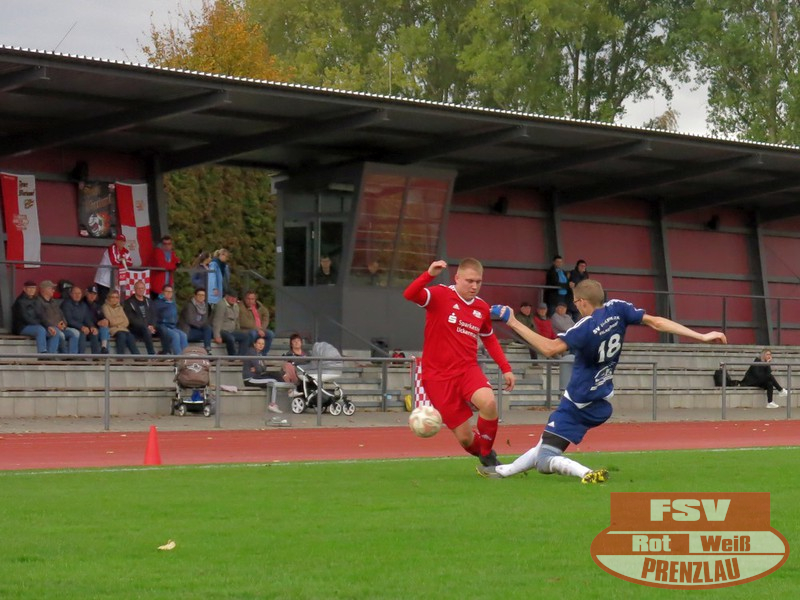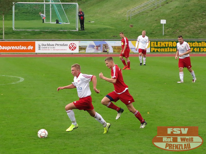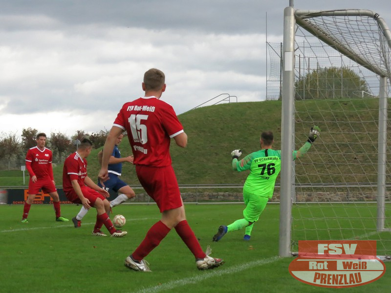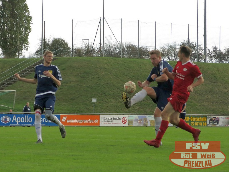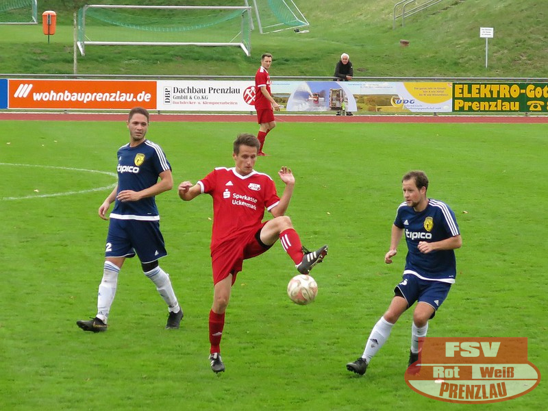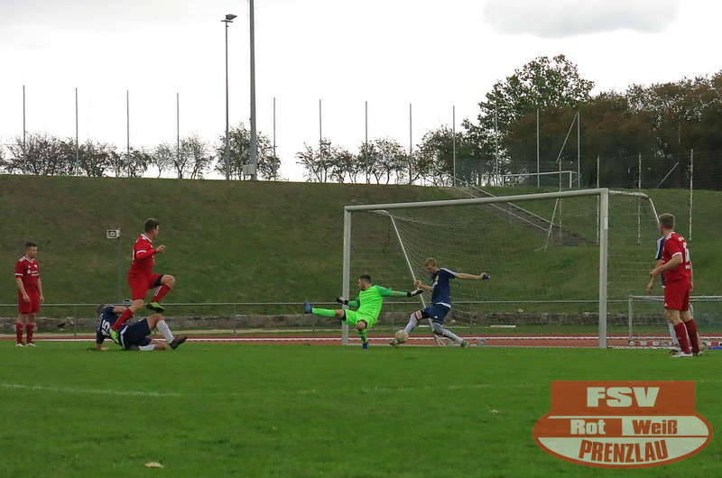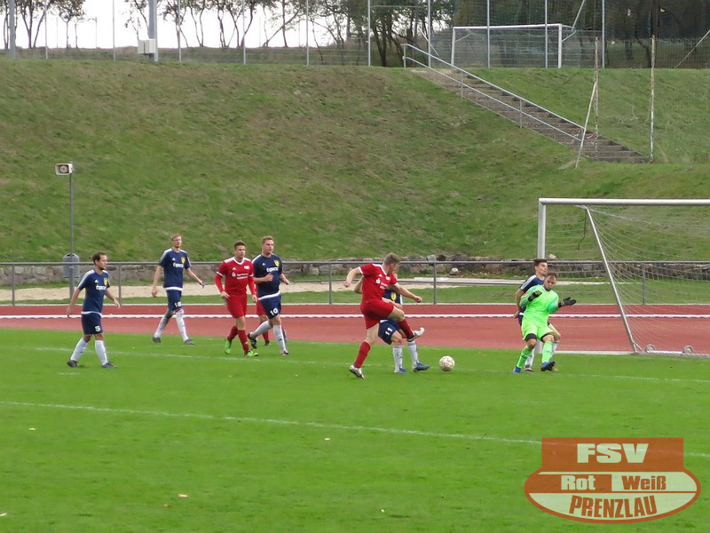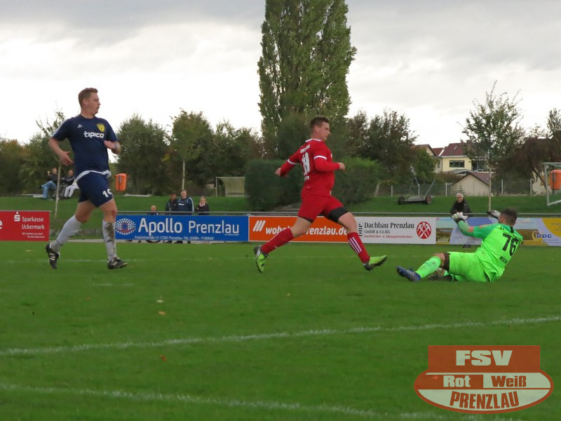 An den vielen vergebenen Großchancen lag es diesmal nicht, dass wieder kein Erfolg auf der Habenseite steht - es gab nämlich relativ wenige für die Rot-Weißen. Dafür stand unser Team von der ersten Minute an unter Druck des SV Lübbenow. So wie in der 5. Minute bei einem Flachschuss von Patryk Trajdecki, wo alle dachten, Udo Burmeister im Tor der Prenzlauer hatte den Ball. Oder doch nicht? Irgendwie trudelte das Leder doch noch unter ihm hindurch und über die Linie ins Tor. Wieder ein frühes Gegentor. In der ersten Viertelstunde fand der FSV so gut wie gar nicht statt. Danach konnte sich unsere Mannschaft zwar etwas befreien, aber druckvoller blieb der Gastgeber. Auffallend die vielen Fehler im Spiel nach vorn. Viel zu oft wurden die Bälle in Räume gespielt, wo weit und breit kein eigener Spieler zu sehen war oder der Ball landete gleich in des Gegners Füßen. So verpufften die meisten Vorstöße, bevor es ernst wurde. Wurden die Angriffe doch einmal zu Ende geführt, war der Torhüter der Lübbenower zur Stelle. Fast mit dem Halbzeitpfiff gelang Lucas Ulfig dann doch der Treffer zum 1:1 Halbzeitstand.