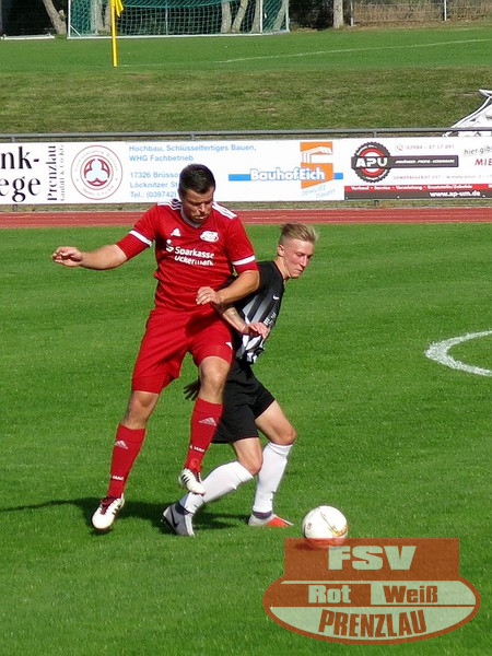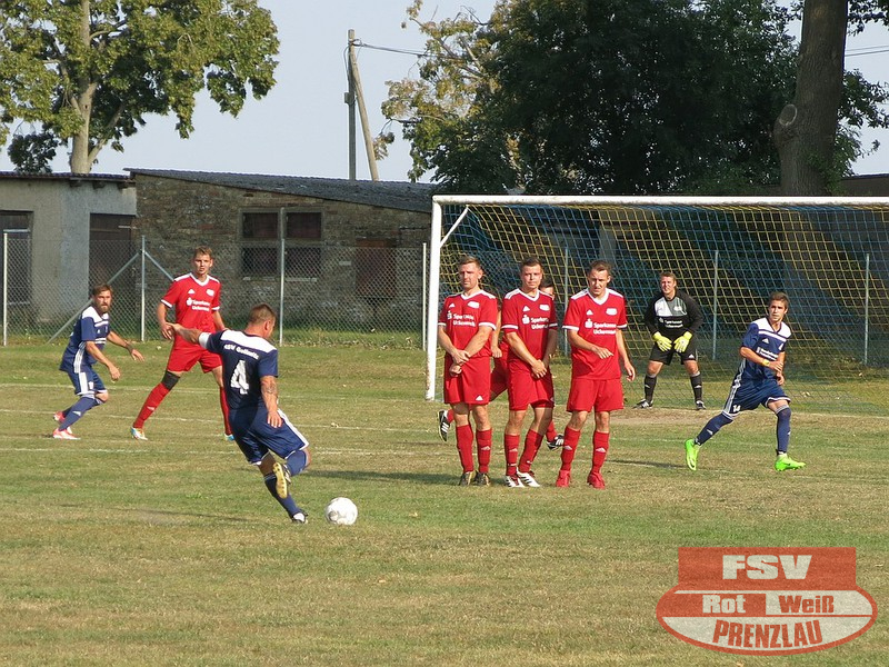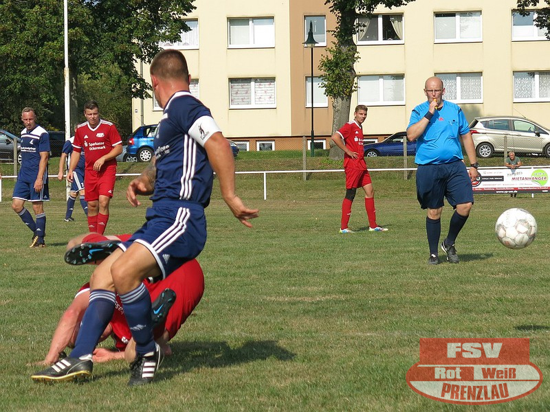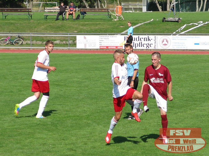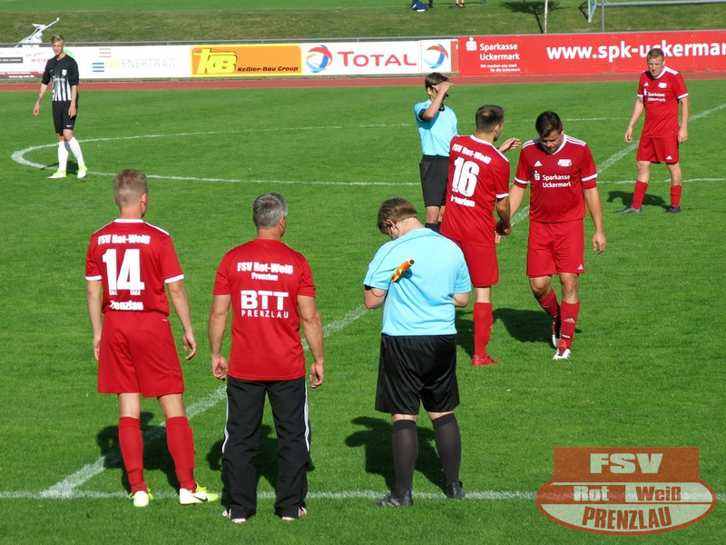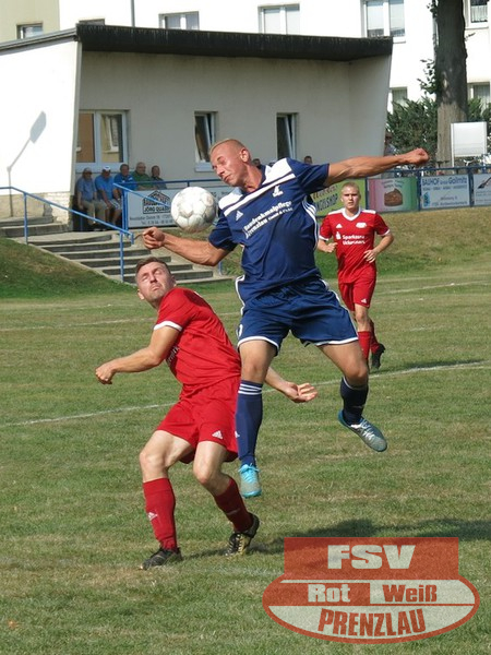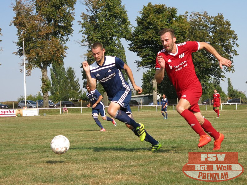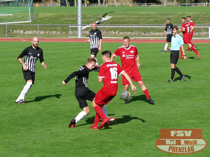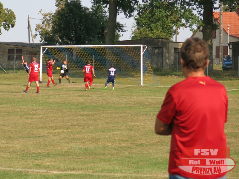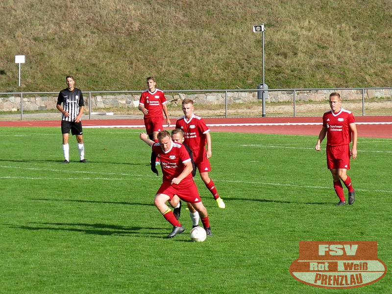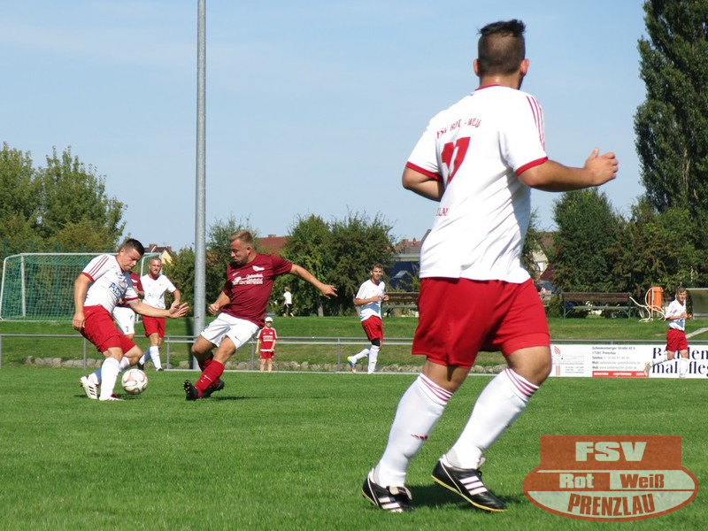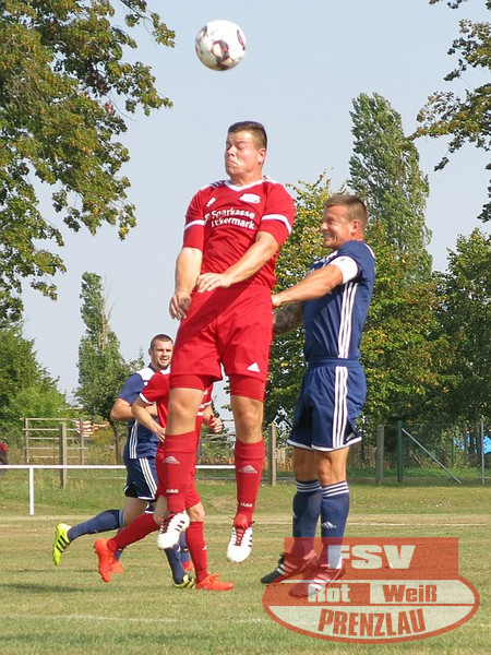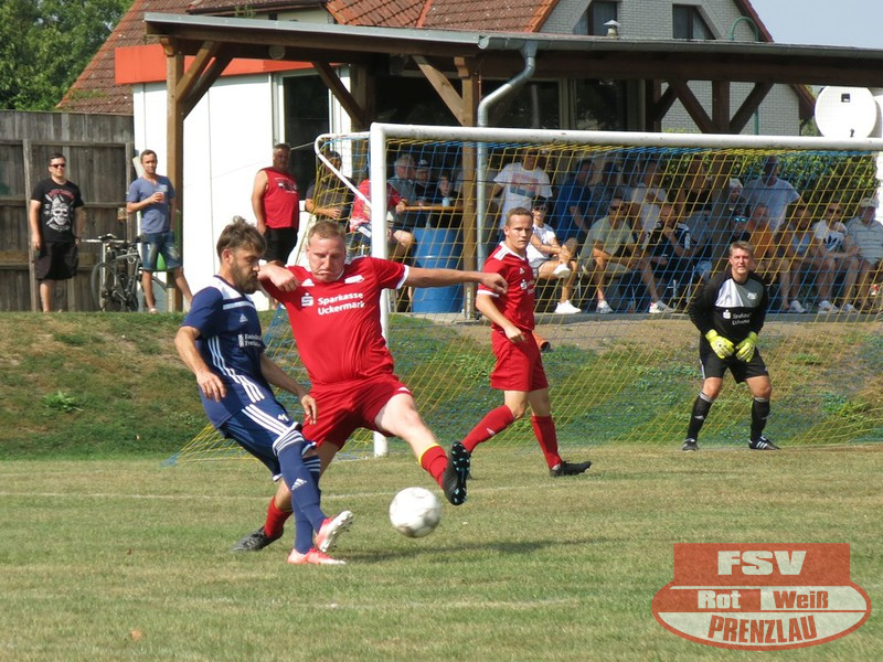 Damit hätte vor dem Spiel wohl keiner gerechnet - der Aufsteiger schickt den amtierenden Meister mit einem 4:0 nach Hause. Nachdem das Remis am ersten Spieltag in Pinnow noch mit einer gehörigen Portion Glück und einer respektablen Abwehrleistung erkämpft wurde, sah das heute schon ganz anders aus. Bis auf einige wenige Situationen stand die Abwehr wieder ziemlich sicher und ließ die Boitzenburger Angreifer kaum zur Entfaltung kommen. Die Boitzenburger Elf war zwar durchaus bemüht, das Heft in die Hand zu nehmen und die Gestaltung des Spiels zu übernehmen, allerdings fehlte diesen Aktionen die Dynamik. Das Gefühl von echter Gefahr wollte nur phasenweise aufkommen. Das frühe 1:0 in der 5. Minute spielte dazu den Hausherren auch noch in die Karten. Dabei hätte es so eigentlich gar nicht fallen dürfen. Als Jeromé Schulz von rechts die gesamte Abwehr überflankte und der Ball beim freien Christoph Schmidt landete, entschied der sich nach kurzem Überlegen, einfach mal aus spitzem Winkel auf das Tor zu schießen. Es schien, als würde der Boitzenburger Torhüter die Situation nicht allzu ernst nehmen, doch der Ball landete, gar nicht mal scharf getreten, im Netz. Von da an konnten die Rot-Weißen aus sicherer Deckung heraus immer wieder zu Kontern ansetzen. Aus diesen Situationen heraus fielen dann in Halbzeit zwei auch die Tore bis zum 4:0. Auffällig dabei, alle drei erfolgreichen Gegenstöße wurden über die rechte Seite eingeleitet. In die Torschützenliste eintragen durften sich dabei Fabian Meylahn, Lucas Ulfig und Jeromé Schulz. Wer allerdings dachte, Boitzenburg würde irgendwann anfangen sich gegen die drohende Niederlage zu stemmen, sah sich getäuscht. Es gelang ihnen im Verlauf des Spiels immer weniger, einen Gang höher zu schalten. Und dann war da natürlich wieder der zur Zeit glänzend aufgelegte Prenzlauer Torhüter. Udo Burmeister reagierte mehrmals großartig, z.B. in der 63. Minute als drei Boitzenburger völlig frei an der Strafraumgrenze auftauchten und er das eigentlich sichere 3:1 verhinderte.