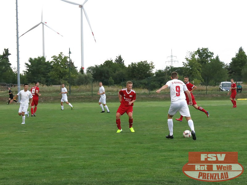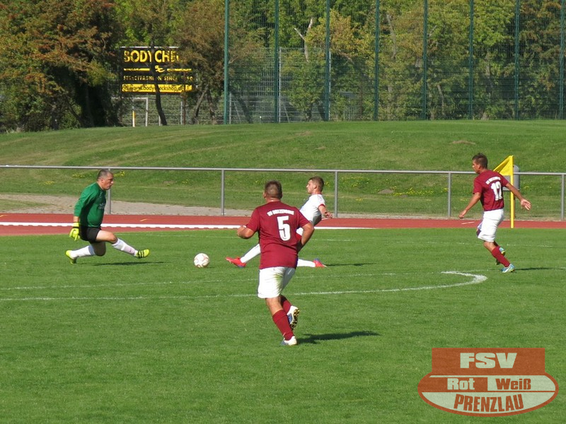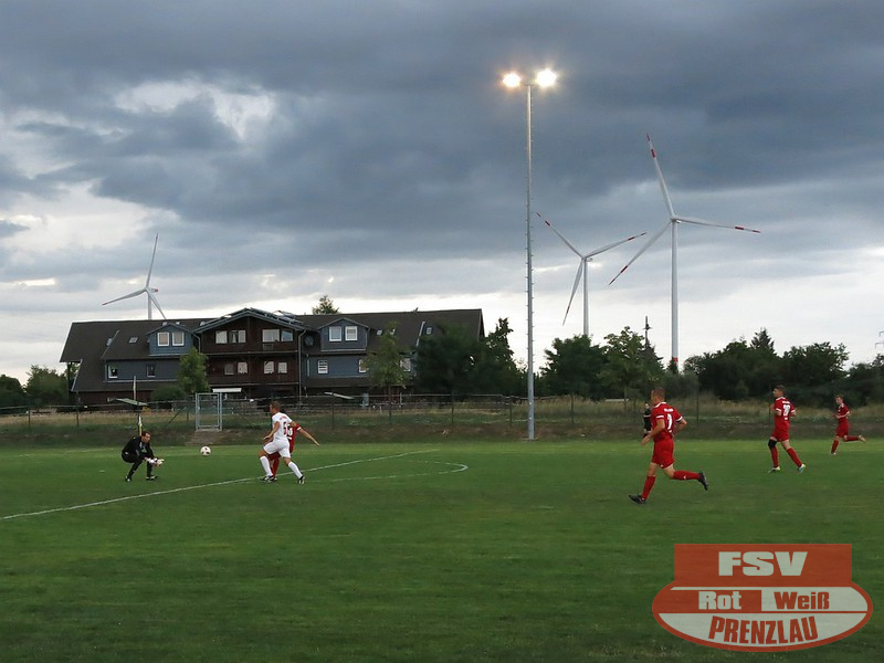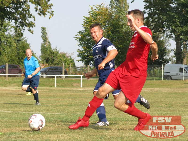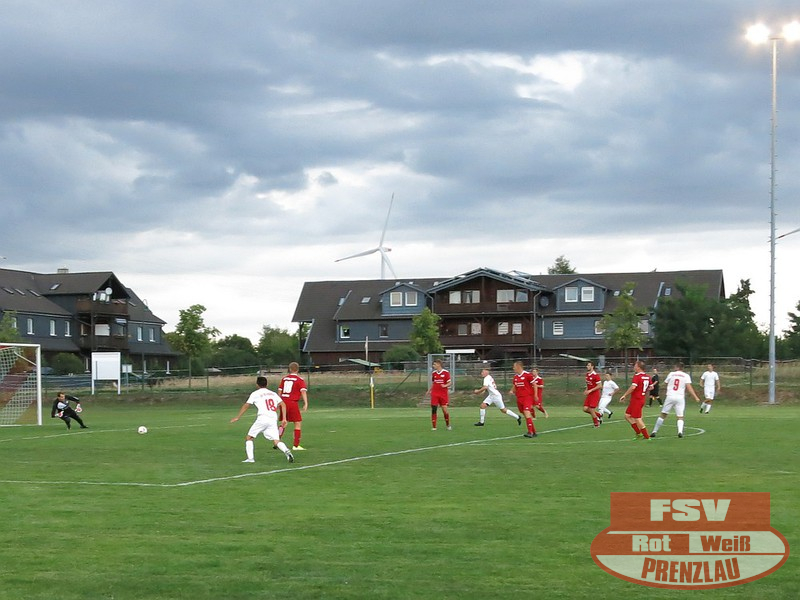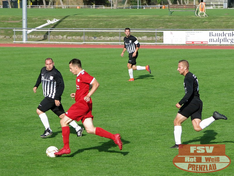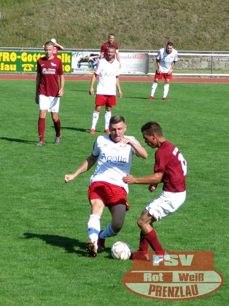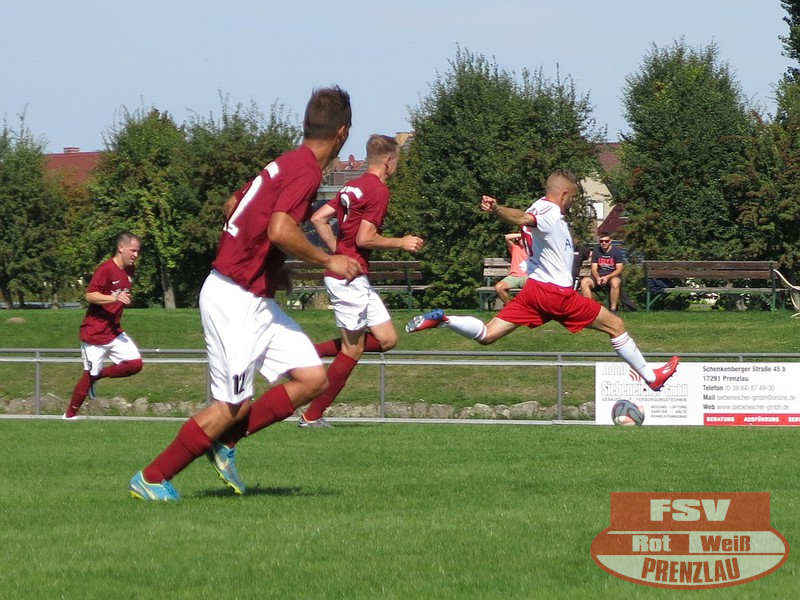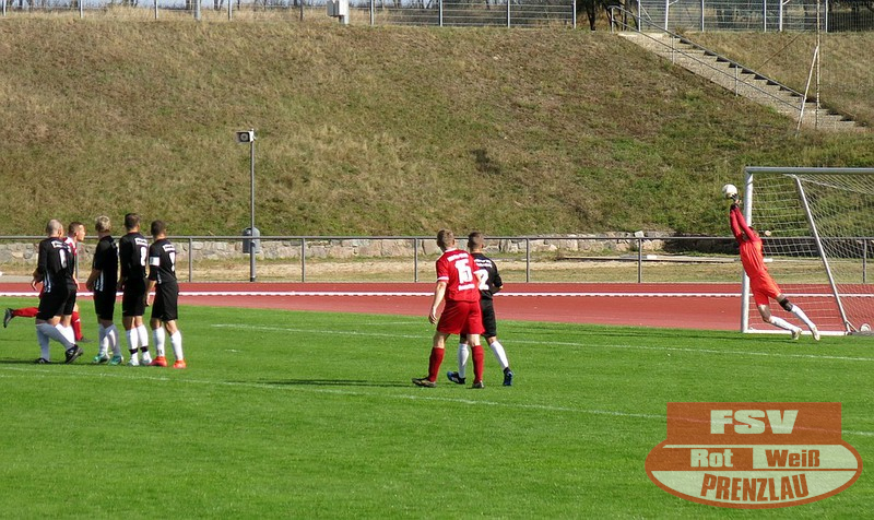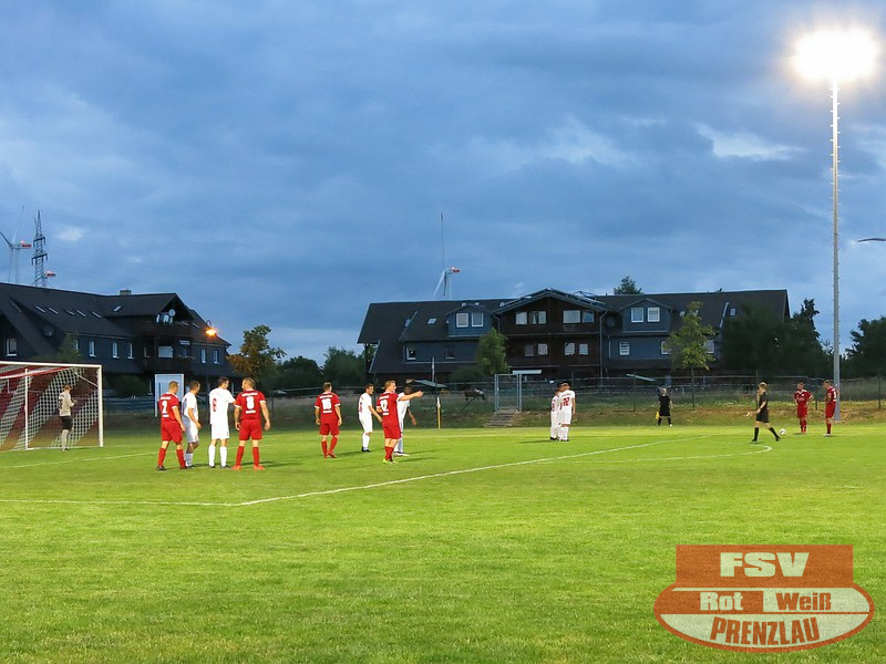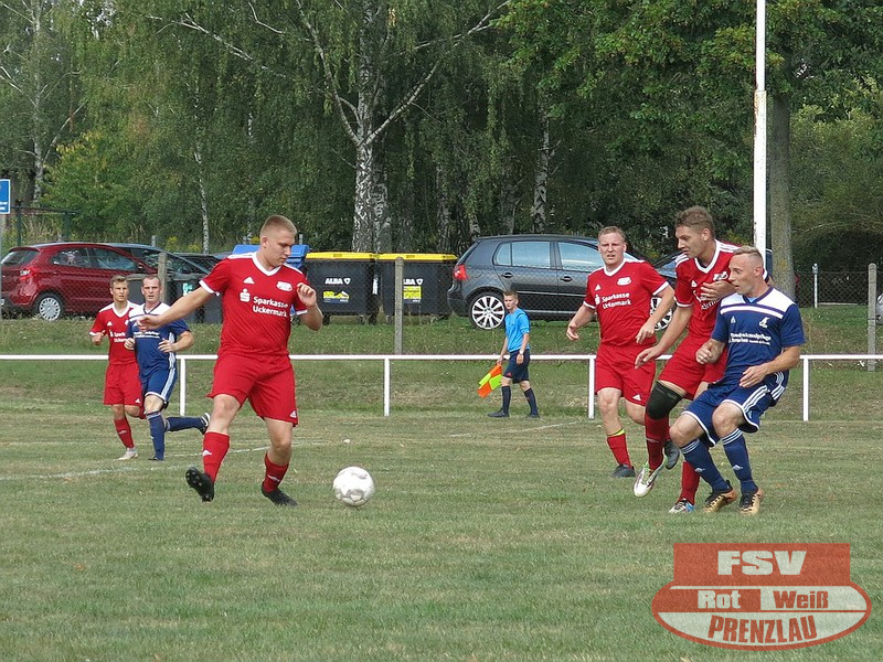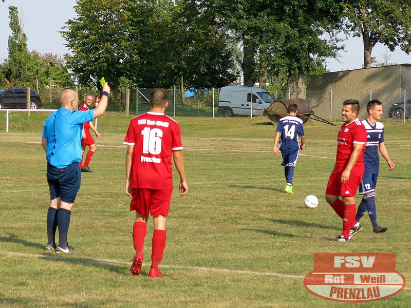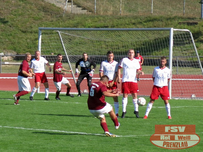 Damit hätte vor dem Spiel wohl keiner gerechnet - der Aufsteiger schickt den amtierenden Meister mit einem 4:0 nach Hause. Nachdem das Remis am ersten Spieltag in Pinnow noch mit einer gehörigen Portion Glück und einer respektablen Abwehrleistung erkämpft wurde, sah das heute schon ganz anders aus. Bis auf einige wenige Situationen stand die Abwehr wieder ziemlich sicher und ließ die Boitzenburger Angreifer kaum zur Entfaltung kommen. Die Boitzenburger Elf war zwar durchaus bemüht, das Heft in die Hand zu nehmen und die Gestaltung des Spiels zu übernehmen, allerdings fehlte diesen Aktionen die Dynamik. Das Gefühl von echter Gefahr wollte nur phasenweise aufkommen. Das frühe 1:0 in der 5. Minute spielte dazu den Hausherren auch noch in die Karten. Dabei hätte es so eigentlich gar nicht fallen dürfen. Als Jeromé Schulz von rechts die gesamte Abwehr überflankte und der Ball beim freien Christoph Schmidt landete, entschied der sich nach kurzem Überlegen, einfach mal aus spitzem Winkel auf das Tor zu schießen. Es schien, als würde der Boitzenburger Torhüter die Situation nicht allzu ernst nehmen, doch der Ball landete, gar nicht mal scharf getreten, im Netz. Von da an konnten die Rot-Weißen aus sicherer Deckung heraus immer wieder zu Kontern ansetzen. Aus diesen Situationen heraus fielen dann in Halbzeit zwei auch die Tore bis zum 4:0. Auffällig dabei, alle drei erfolgreichen Gegenstöße wurden über die rechte Seite eingeleitet. In die Torschützenliste eintragen durften sich dabei Fabian Meylahn, Lucas Ulfig und Jeromé Schulz. Wer allerdings dachte, Boitzenburg würde irgendwann anfangen sich gegen die drohende Niederlage zu stemmen, sah sich getäuscht. Es gelang ihnen im Verlauf des Spiels immer weniger, einen Gang höher zu schalten. Und dann war da natürlich wieder der zur Zeit glänzend aufgelegte Prenzlauer Torhüter. Udo Burmeister reagierte mehrmals großartig, z.B. in der 63. Minute als drei Boitzenburger völlig frei an der Strafraumgrenze auftauchten und er das eigentlich sichere 3:1 verhinderte.