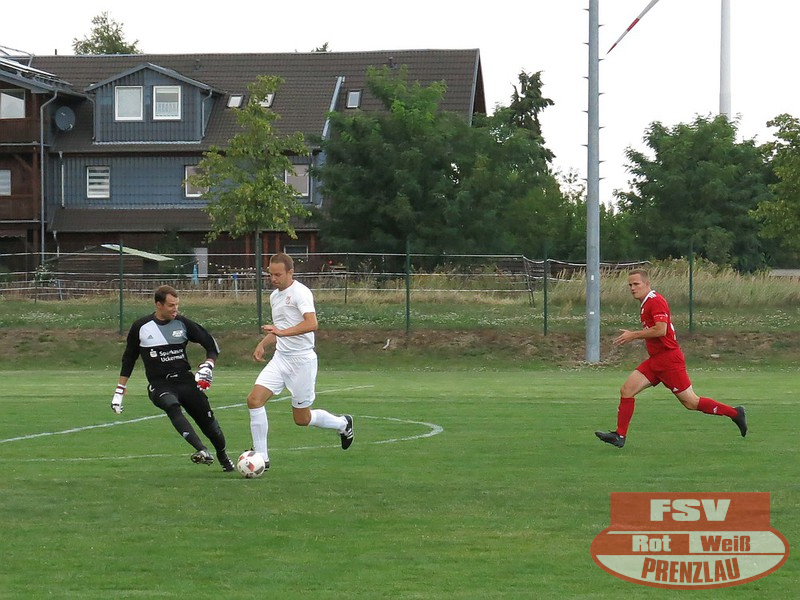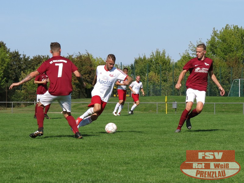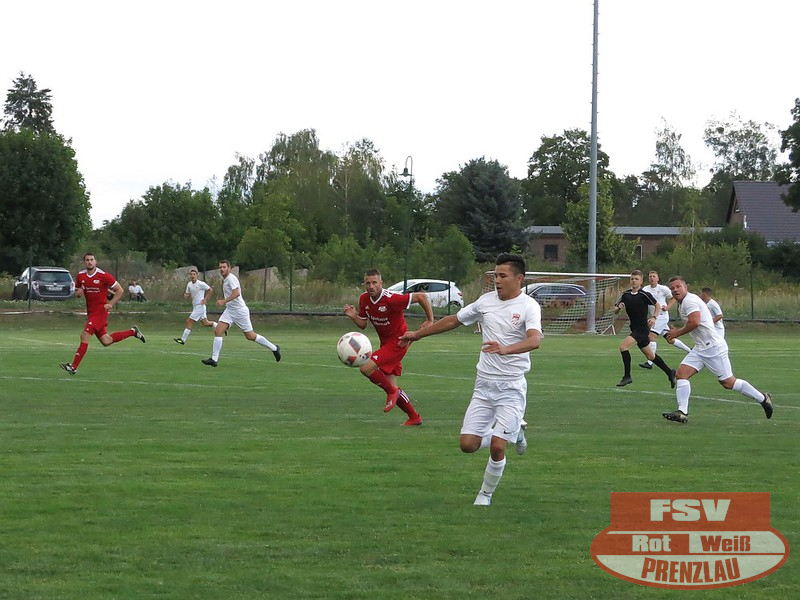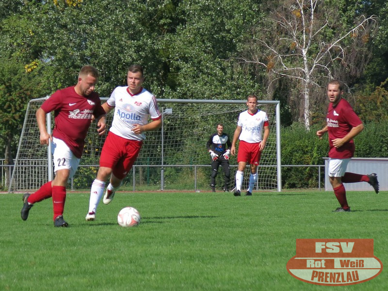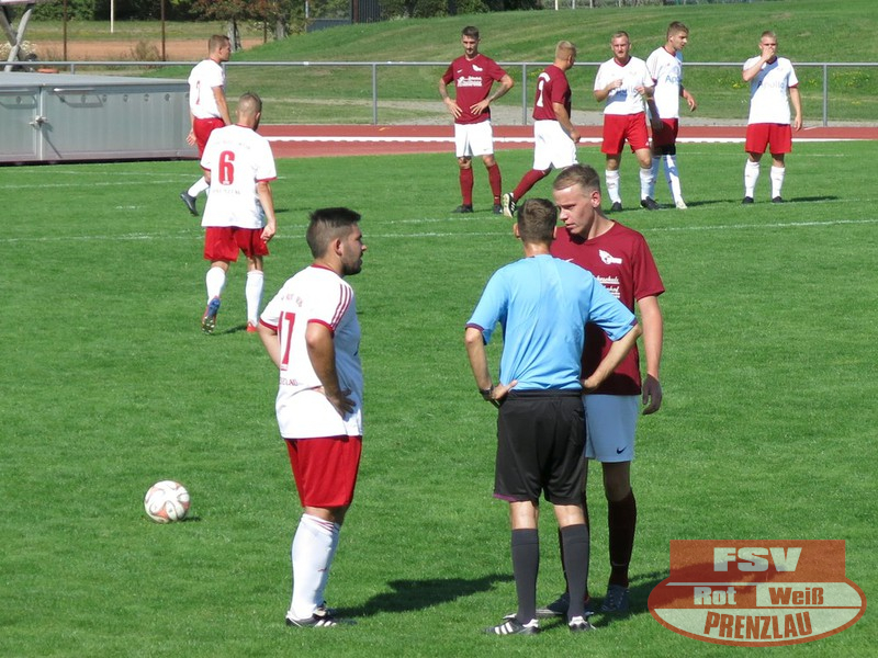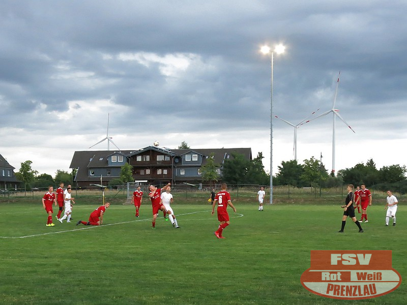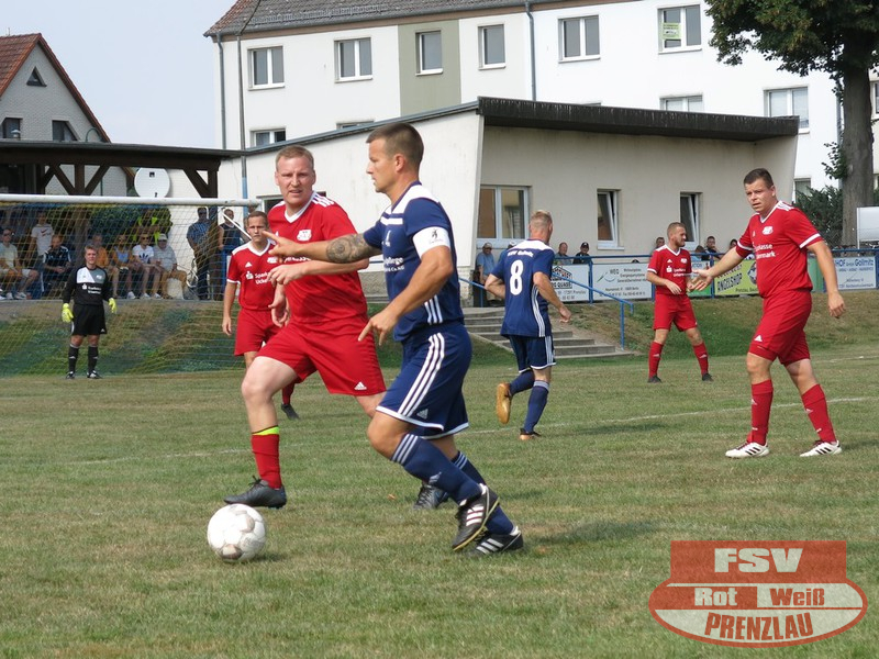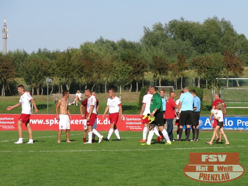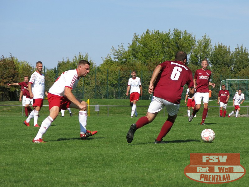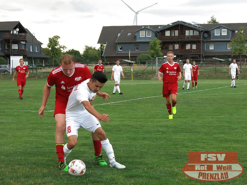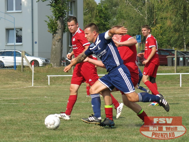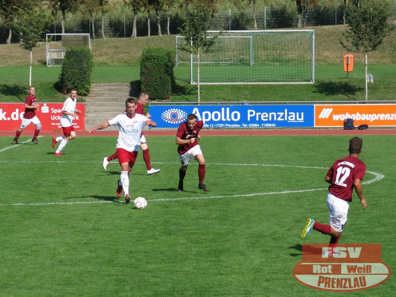 Damit hätte vor dem Spiel wohl keiner gerechnet - der Aufsteiger schickt den amtierenden Meister mit einem 4:0 nach Hause. Nachdem das Remis am ersten Spieltag in Pinnow noch mit einer gehörigen Portion Glück und einer respektablen Abwehrleistung erkämpft wurde, sah das heute schon ganz anders aus. Bis auf einige wenige Situationen stand die Abwehr wieder ziemlich sicher und ließ die Boitzenburger Angreifer kaum zur Entfaltung kommen. Die Boitzenburger Elf war zwar durchaus bemüht, das Heft in die Hand zu nehmen und die Gestaltung des Spiels zu übernehmen, allerdings fehlte diesen Aktionen die Dynamik. Das Gefühl von echter Gefahr wollte nur phasenweise aufkommen. Das frühe 1:0 in der 5. Minute spielte dazu den Hausherren auch noch in die Karten. Dabei hätte es so eigentlich gar nicht fallen dürfen. Als Jeromé Schulz von rechts die gesamte Abwehr überflankte und der Ball beim freien Christoph Schmidt landete, entschied der sich nach kurzem Überlegen, einfach mal aus spitzem Winkel auf das Tor zu schießen. Es schien, als würde der Boitzenburger Torhüter die Situation nicht allzu ernst nehmen, doch der Ball landete, gar nicht mal scharf getreten, im Netz. Von da an konnten die Rot-Weißen aus sicherer Deckung heraus immer wieder zu Kontern ansetzen. Aus diesen Situationen heraus fielen dann in Halbzeit zwei auch die Tore bis zum 4:0. Auffällig dabei, alle drei erfolgreichen Gegenstöße wurden über die rechte Seite eingeleitet. In die Torschützenliste eintragen durften sich dabei Fabian Meylahn, Lucas Ulfig und Jeromé Schulz. Wer allerdings dachte, Boitzenburg würde irgendwann anfangen sich gegen die drohende Niederlage zu stemmen, sah sich getäuscht. Es gelang ihnen im Verlauf des Spiels immer weniger, einen Gang höher zu schalten. Und dann war da natürlich wieder der zur Zeit glänzend aufgelegte Prenzlauer Torhüter. Udo Burmeister reagierte mehrmals großartig, z.B. in der 63. Minute als drei Boitzenburger völlig frei an der Strafraumgrenze auftauchten und er das eigentlich sichere 3:1 verhinderte.