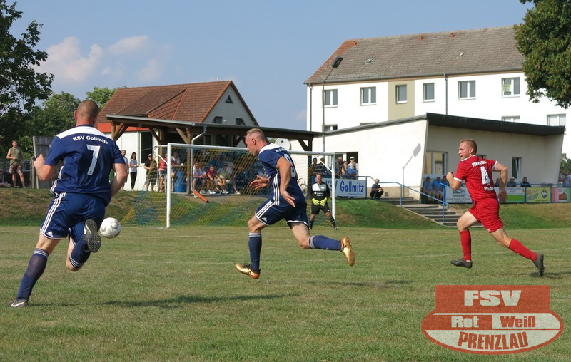 Die kurze Reise der SpG Prenzlau/Dedelow ging heute nach Gollmitz zum KSV und das Spiel begann recht flott und erfolgversprechend, zumindest auf Prenzlauer Seite. Während Gollmitz das Spiel machte, stürmten die Rot-Weißen zweimal auf das Gollmitzer Tor zu und trafen zweimal. Treffer eins in der 3. Minute durch Christoph Schmidt und Treffer zwei durch Markus Müller in Minute 6. Nicht schön, aber auf dem Gollmitzer Rumpelrasen nicht die schlechteste Idee, mit weiten Anspielen in die Spitze und schnellen Anläufen auf das Tor für Gefahr zu sorgen. In der Folge gelang das allerdings kaum noch. Spielerische Elemente waren Mangelware. Auch die Zweikampfführung war dürftig. Zwar gibt es keine Statistik darüber, aber gefühlt hat der KSV 80 Prozent der Zweikämpfe für sich entschieden. Die KSV-Stürmer spielten sich viel zu oft und viel zu leicht durch die Prenzlauer Abwehr. So fiel dann fast zwangsläufig, allerdings erst durch einen Freistoß, der Anschlusstreffer zum 1:2 in der 37. Minute.