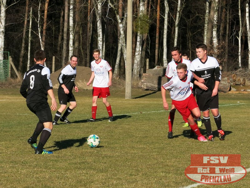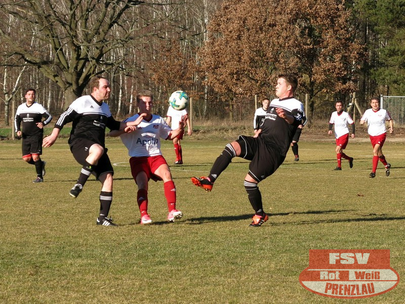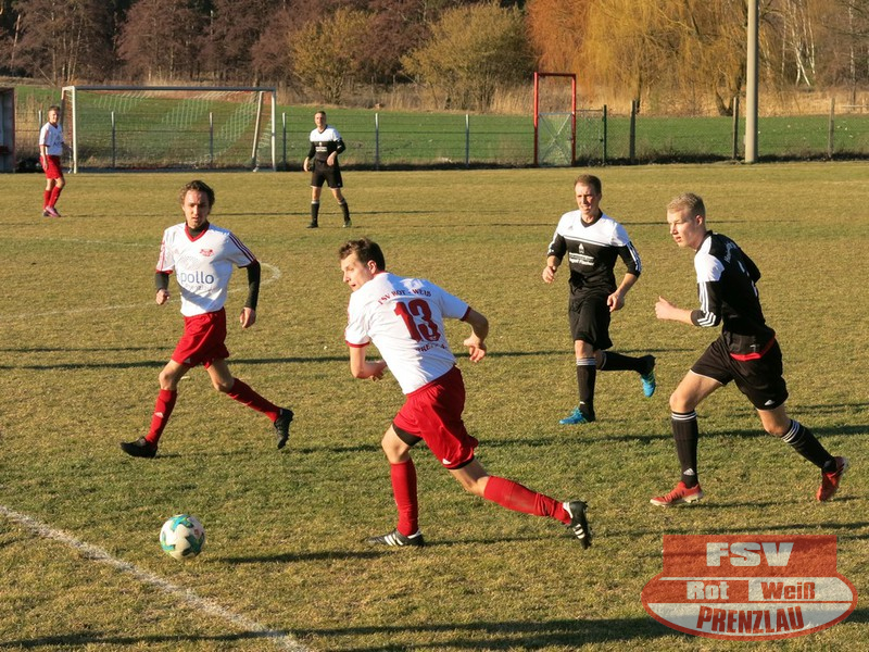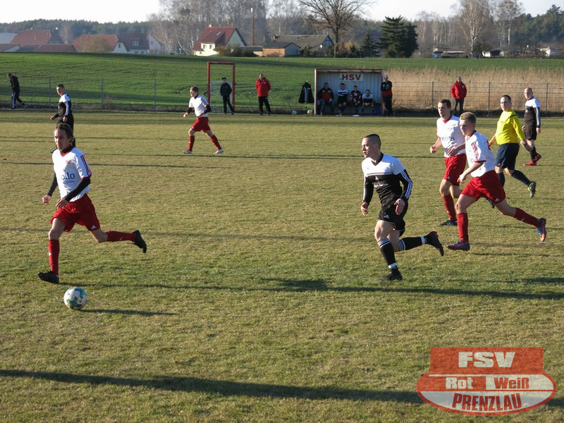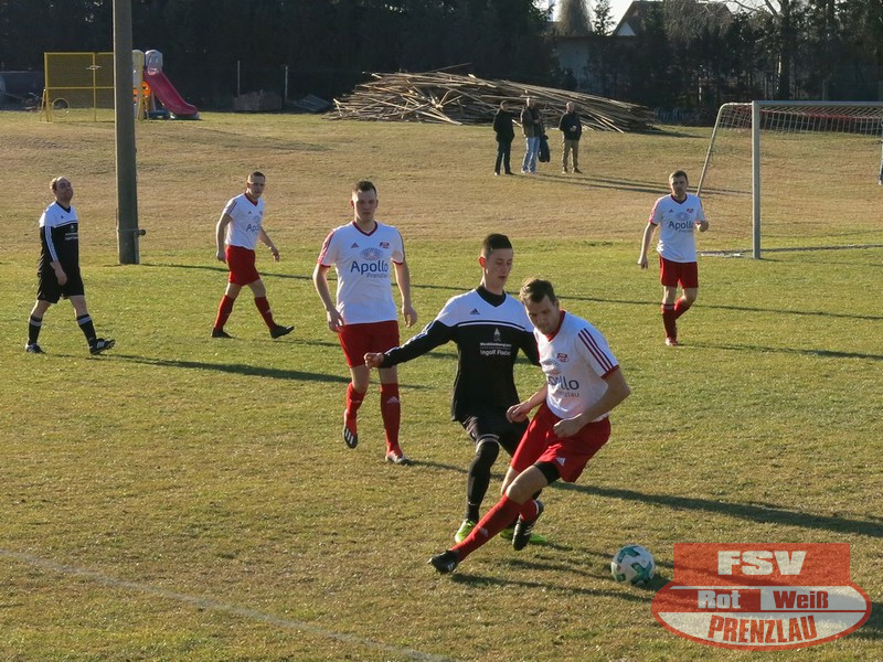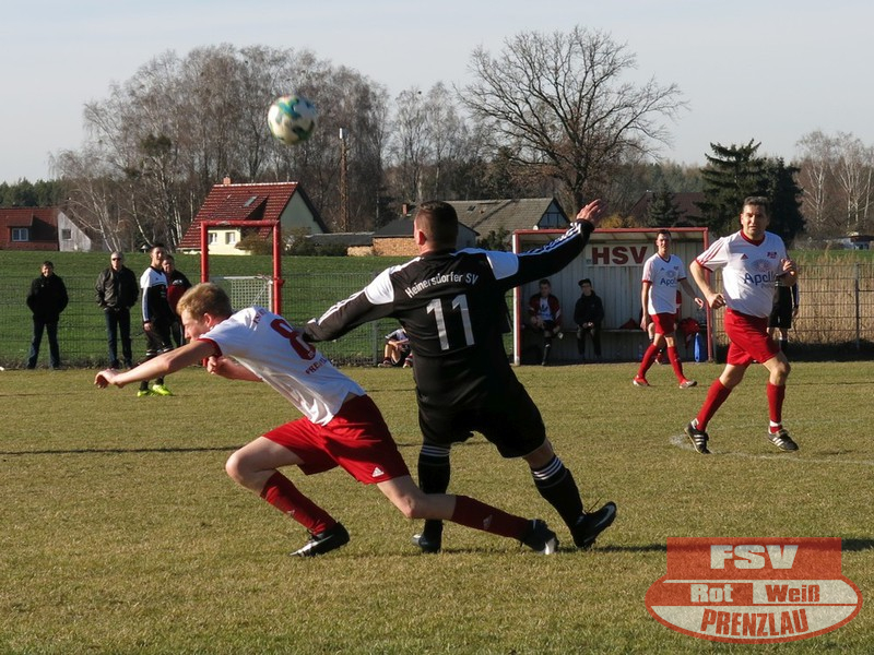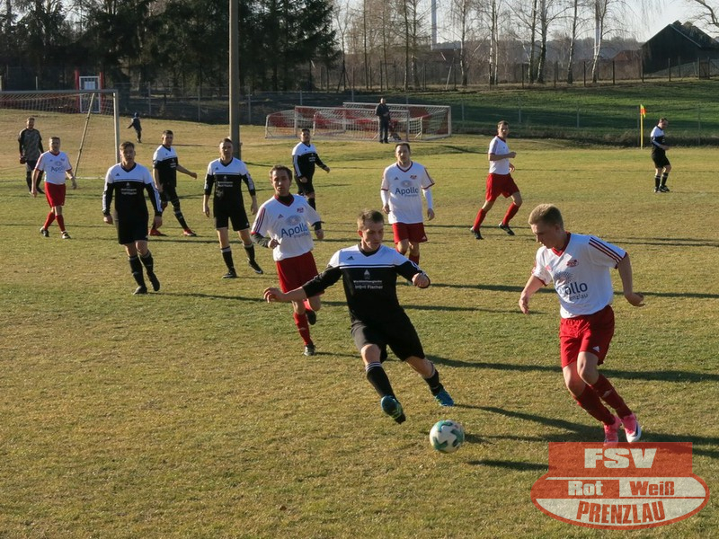 Nach nur einer Woche Training stand das erste Testspiel der Männermannschaft an. Dazu ging es zum Heinersdorfer SV, derzeit Sechster der Dähn-Liga Uckermark. Bei besten äußeren (Frühlings-) Bedingungen hatte Prenzlau den deutlich besseren Start. Der FSV durch schnelle Vorstöße Richtung HSV-Tor stets gefährlich, lag nach Toren von Danny, Krafti und Udo nach 26 Minuten bereits mit 3:0 vorn. Besonders das dritte Tor ist bemerkenswert, hier traf nämlich Stammtorhüter Udo Burmeister, an diesem Tag als Mittelstürmer eingesetzt. Er machte seine Sache über die gesamte Spielzeit so gut, dass sich die angestammten Stürmer in Zukunft wohl warm anziehen müssen. So sehr das Zwischenergebnis den Prenzlauern gefiel, so wenig passte das den zwei Ligen höher spielenden Heinersdorfern offensichtlich ins Konzept. Die Unsportlichkeiten in und am Spielfeld nahmen zu und brachten mehr und mehr Gift in das Geschehen. Auch der Schiedsrichter trug nicht unbedingt dazu bei, die Wogen wieder zu glätten. So gab es dann kurz vor dem Halbzeitpfiff einen diskussionswürdigen - und auch viel diskutierten - Strafstoß, mit dem der HSV auf 1:3 verkürzte. Kurz nach Beginn der zweiten Halbzeit eine Unaufmerksamkeit der Prenzlauer. Ein strammer Schuss aus fast 30 Metern landete krachend im Tor des FSV. Danach übernahm Heinersdorf immer mehr die Spielführung. Prenzlau konditionell abbauend, verlagerte sich im Wesentlichen auf die Verteidigung des Vorsprungs. Das gelang auch, da der HSV zwar zu einigen Chancen kam, aber zumeist das Prenzlauer Tor um einiges verfehlte. Allerdings hatte der FSV bei zwei Gegenstößen auch dicke Gelegenheiten, das Ergebnis noch zu erhöhen. Zwei Premieren gab es noch zu verzeichnen. Marvin Kuchinke, in der Winterpause vom VfB Gramzow II zum FSV gewechselt, gab seinen Einstand auf dem Rasenplatz und Vincent Utech wurde in Halbzeit zwei eingewechselt. Vincent fiel die gesamte Vorrunde aus, da er sich vor einem halben Jahr beim Vorbereitungsspiel in Eggesin böse an der Schulter verletzt hatte - toi, toi, toi für die kommenden Spiele. Alles in allem ein Ergebnis, das Hoffnung auf eine ebenso erfolgreiche Rückrunde wie die verlustpunktfreie Hinrunde macht - zumal mit Felix Deutschmann, Martin Tamms, Alexander Mante und Sebastian Turowski noch einige Stammkräfte fehlten.