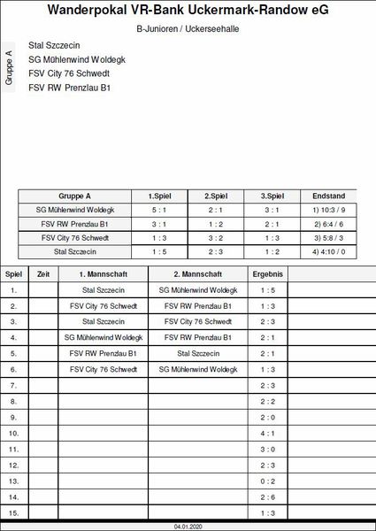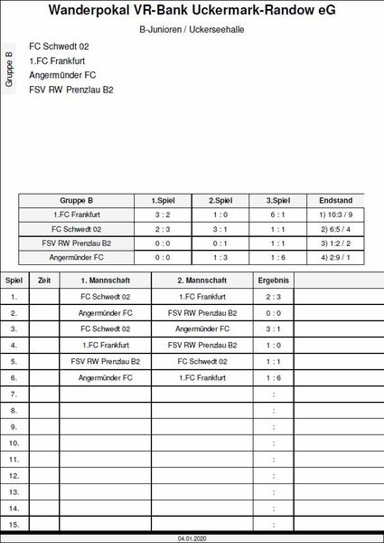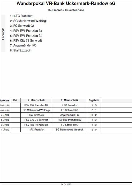 Ebenfalls mit zwei Mannschaften traten die B-Junioren beim Turnier um den "Wanderpokal der VR-Bank Uckermark-Randowtal eG" an. Sieger war hier der 1. FC Frankfurt. Unsere beiden Teams landeten auf den Plätzen 4 und 5.