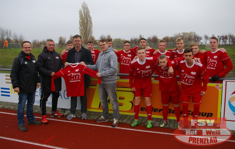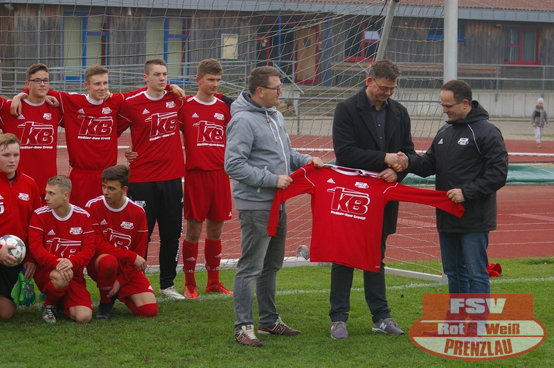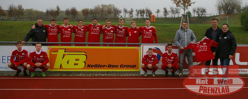 Bevor der Anpfiff zum Landesklasse-Punktspiel der A-Junioren gegen Blau-Weiß Petershagen-Eggersdorf ertönte, wurde der Mannschaft um Trainer Frank Ruthenberg ein neuer Trikotsatz überreicht. Sponsor ist die Keßler Bau AG mit Sitz in Hohengüstow. Ronny Keßler (Geschäftsführer) und Steffen Retzlaff (Prokurist) haben es sich nicht nehmen lassen, die Trikotübergabe am frühen Sonntagvormittag selbst zu übernehmen. Als regionales Unternehmen unterstützen sie unseren Verein auch als Anerkennung für die bisher gezeigten kontinuierlichen Leistungen vor allem in der Jugendarbeit und für das bodenständige Auftreten des Vereins in der Öffentlichkeit. Wir bedanken uns für die Unterstützung und hoffen auf eine weiterhin erfolgreiche Zusammenarbeit. Das Kamerateam von UMTV war bei der Übergabe ebenfalls anwesend und es wird einen kurzen Bericht im Lokalfernsehen geben.