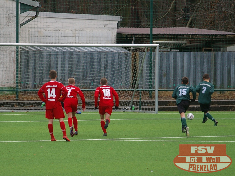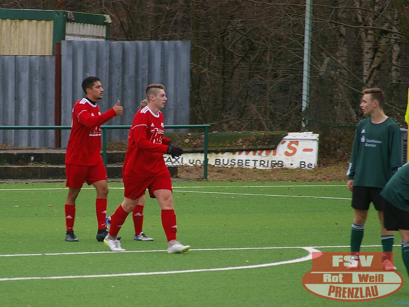 Die Rot-Weißen hatten sich heute was vorgenommen. Das sah man gleich in der Anfangsphase, als Miguel mit dem 1. Eckball nach 2 Minuten per Kopf das 1:0 machte. Alles schien zu laufen. Aber die SpG FV Preussen/Lok Eberswalde/1.FC Finowfurt hatte was dagegen. Sie kamen immer wieder mit ihren schnellen Außen und setzten die Prenzlauer Abwehr mal richtig unter Druck. 11. Minute Elfmeter und es stand 1:1. Aber 3 Minuten später erneut Miguel reaktionsschnell aus 5 Meter ins Tor. Das sollte eigentlich Sicherheit geben. Aber denkste. Immer wieder die gleichen Fehler. Ruck zuck wieder der Ausgleich. Und so ging es weiter. Prenzlau baute kaum Druck auf und die Eberswalder kamen über die schnellen Außen immer wieder zu Chancen und so auch zum 3:2 in der 40. Minute - Halbzeit!