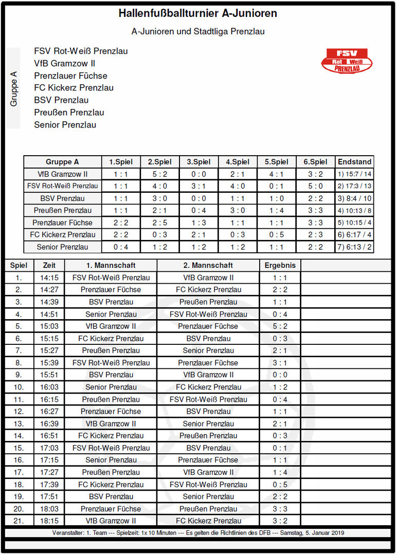 Beim Hallenturnier der A-Junioren gegen Gastmannschaften aus der Prenzlauer Stadtliga und gegen die Zweite des VfB Gramzow erreichte die junge Truppe von Trainer Frank Ruthenberg einen sehr guten zweiten Platz. Knapper aber verdienter Turniersieger wurde der VfB Gramzow II. Über den Pokalgewinn enschied am Ende ein einziges Tor, welches der VfB in der letzten Spielminute des Turniers erzielte. Einen sicheren Rang 3 erspielte sich der BSV Prenzlau. Unser FC Kickerz kämpfte zwar wacker, landete schlussendlich aber lediglich auf Platz 6.