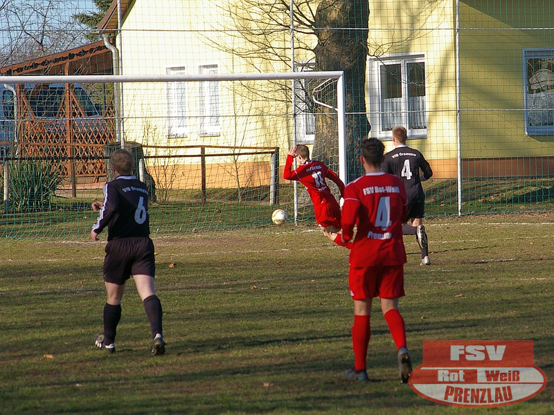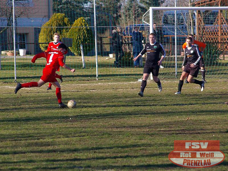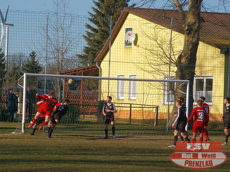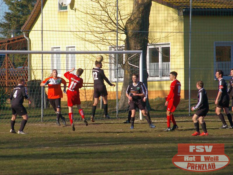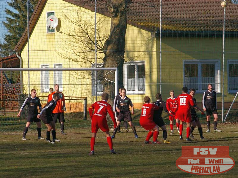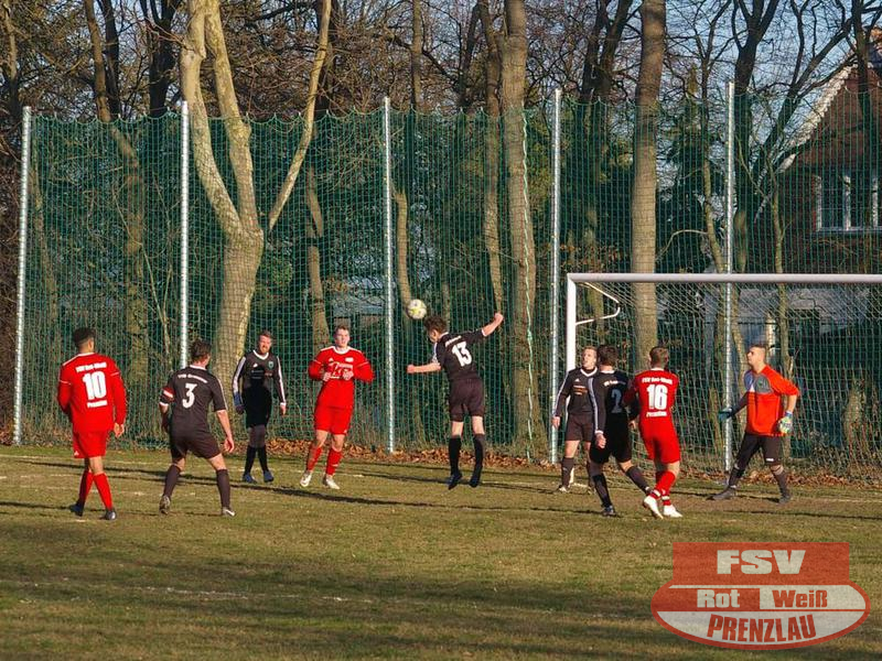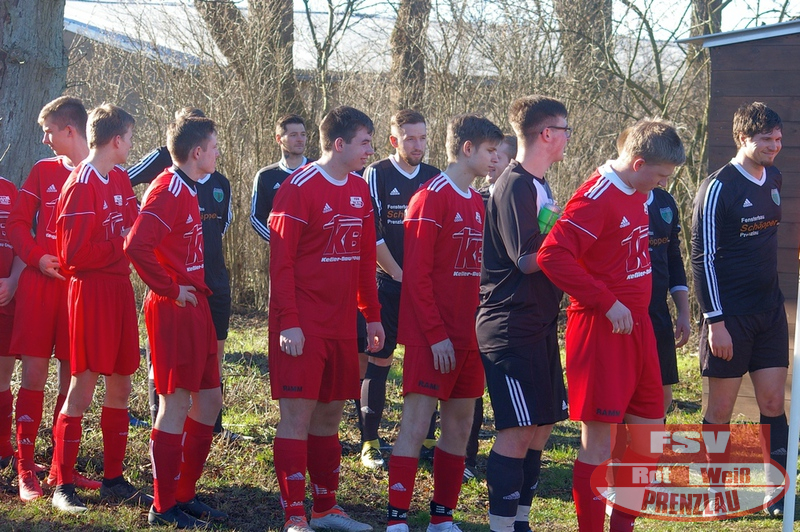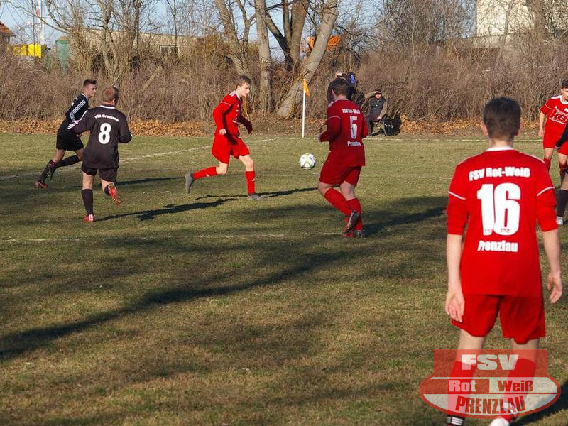 Den ersten Test nach 12 Wochen Freiluftpause gewannen die A-Junioren des FSV Rot-Weiß Prenzlau am Sonntag in Lützlow gegen die 2. Männermanschaft vom VfB Gramzow - aktuell Herbstmeister in der Kreisliga Uckermark - verdient mit 3:2. Viele der ca. 50 Zuschauer staunten, wie sich die Junioren präsentierten. Von Beginn an wurden die Männer beim Spielaufbau unter Druck gesetzt und der Ball erobert. So konnte man immer wieder das eigene Spiel nach vorne gestalten und es wurden Chancen erarbeitet. So ging es immer wieder über rechts nach vorne. Nach mehreren Versuchen endlich der genaue Abschluss duch Felix im Nachsetzen zur Führung. Durch den Gegentreffer wachgerüttelt, kamen die Männer vom VfB immer wieder gefährlich durch die Mitte und setzten dabei auch ihre körperlichen Vorteile ein. So fiel auch dann der Ausgleich. Weiter ging's, Gramzow duch die Mitte und Prenzlau über rechts. Mit der Einwechslung von Florian kam noch ein schneller, robuster Stürmer. Er nutzte kurz vor der Pause seine Chance und schob zum 2:1 in die lange Ecke. Sicherlich gab es in der Halbzeitpause eine klare Ansage vom Gramzower Trainer. Sie begannen ihr Spiel auch über die Außen druckvoller. Aber unsere Mannschaft verteidigte konzentriert. Die beste Torgelegenheit für Prenzlau entstand nach einer Rückgabe der Gramzower zum Torwart (dem Platz sei es geschuldet), die an den Pfosten ging. Dann aber ein Abstimmungsfehler im Mittelfeld und der satte Schuss aus 16m zappelte im Netz zum 2:2. Mit dem Anstoß lief der Ball in den Prenzlauer Reihen und der quirlige Felix nutze seine Torgelegenheit mit einem Schuss ins kurze Eck zur erneuten Führung. Die Gramzower wollten dieses Spiel nicht verlieren und versuchten immer wieder das Ergebnis zu korrigieren. Aber die jungen Rot-Weißen machten es richtig gut und hielten die Führung bis zum Ende des Spiels. Nach dem Spiel gab es Glückwünsche zu Sieg.