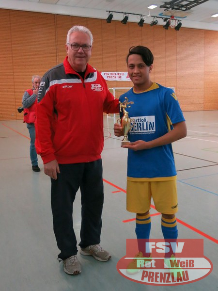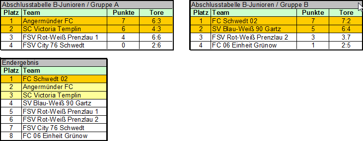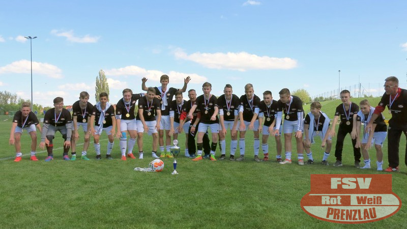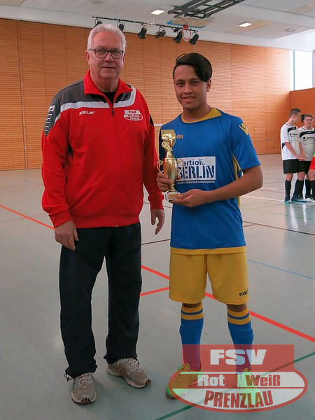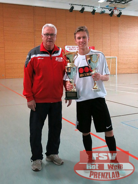 Die Kicker vom FC Schwedt 02 sicherten sich im Finalspiel gegen den Angermünder FC den Wanderpokal. Unsere beiden Mannschaften landeten auf den Plätzen 5 und 6. Durch die kurzfristigen Absagen von Preußen Eberswalde und SV Rollwitz musste das Starterfeld von 10 auf 8 Mannschaften reduziert werden. In den Gruppenspielen traten somit jeweils 4 Teams gegeneinander an. Die beiden Gruppenersten ermittelten dann in der Zwischenrunde die Teilnehmer für das kleine und das große Finale. Hier erreichte Schwedt mit einem deutlichen 6:1 über Templin das Finale. Im zweiten Spiel musste die Entscheidung im 9m-Schießen fallen. Hier gewann Angermünde das Spiel mit insgesamt 7:6 gegen Gartz und qualifizierte sich als zweite Mannschaft für das Finale.
