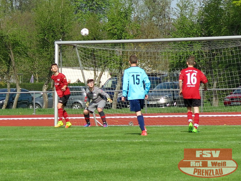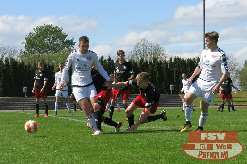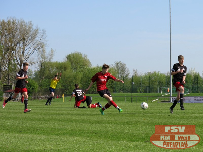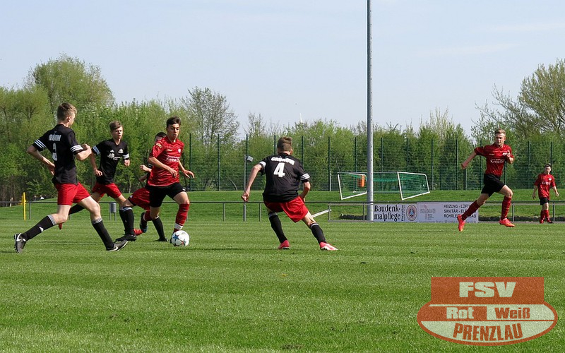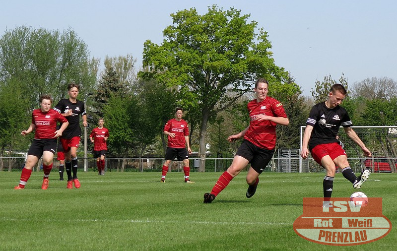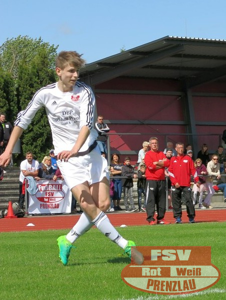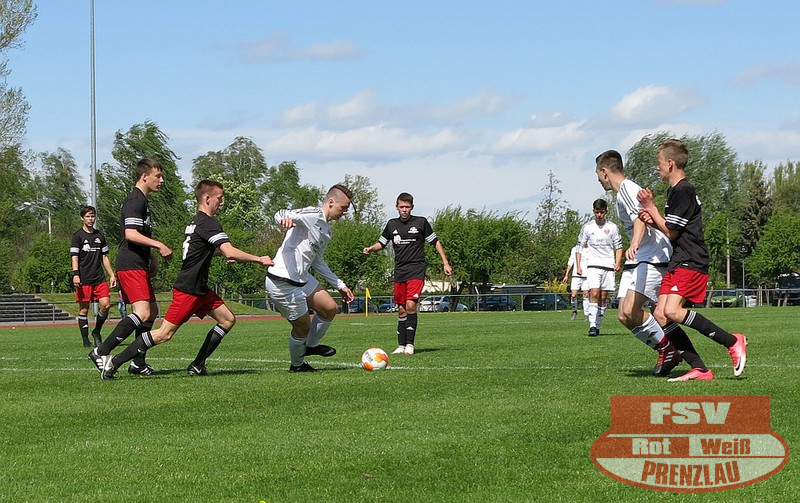 Die B-Junioren behalten auch nach dem gestrigen Heimspiel gegen die SG Schönow/Passow zu Hause ihre weiße Weste - 6 Siege bei einem Torverhältnis von 60:0. Die erste Halbzeit zeigte allerdings ein relativ verteiltes Spiel. Schönow kam vor allem nach Standards einige Male gefährlich vor das Prenzlauer Tor. Den einzigen Treffer in Halbzeit eins erzielten aber die Rot-Weißen in der 18. Minute durch Florian Redmann, dessen Schuss aus spitzem Winkel sich noch etwas glücklich über den Schönower Keeper hinweg ins Tor senkte. In Halbzeit zwei dann das erwartete dominante Auftreten der Prenzlauer. Schönow gelang nach vorne praktisch nichts mehr und Prenzlau erzielte weitere vier Tore zum Endstand von 5:0, wobei noch einiges an Chancen liegenblieb.