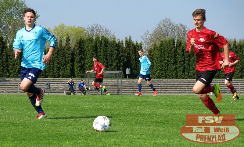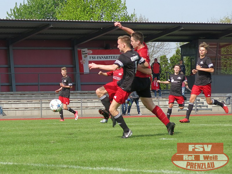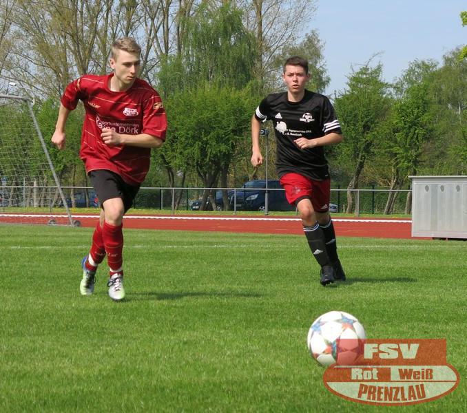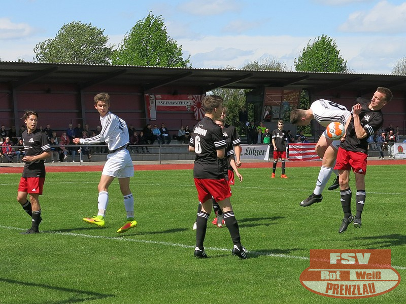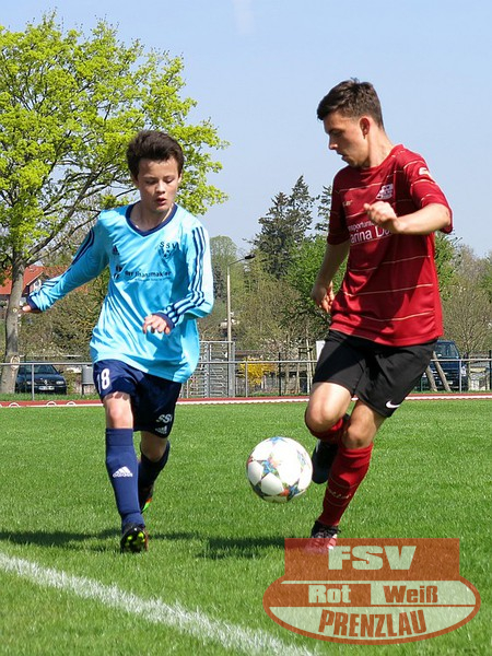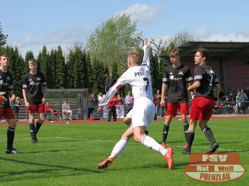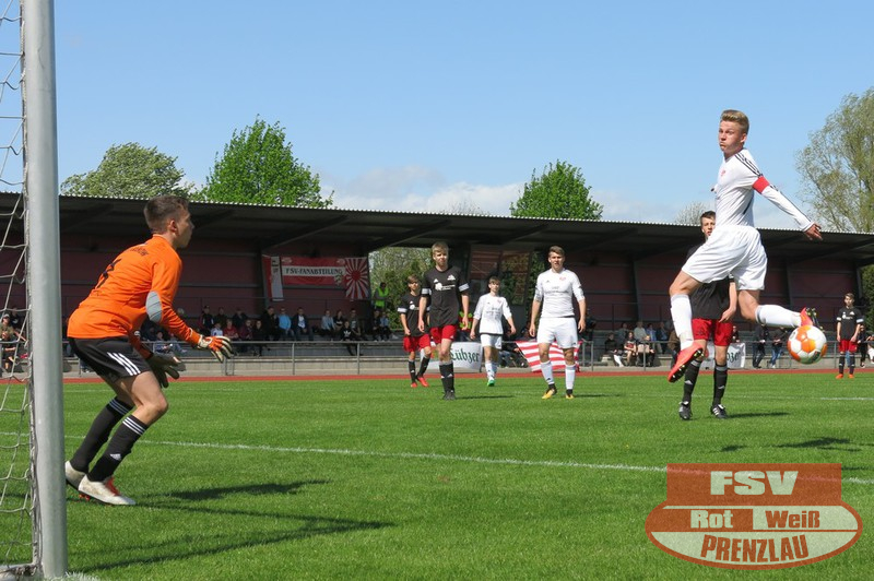 Zum heutigen Punktspiel empfingen die B-Junioren den aktuell Tabellenvierten, die Mannschaft von Einheit Grünow im Uckerstadion. Die gleiche Begegnung wird es am 1. Mai an gleicher Stelle wieder geben - dann aber im Kreispokalfinale. Obwohl die Chancenverwertung, besonders in der zweiten Halbzeit, zu wünschen übrig ließ, stand nach Spielschluss ein deutliches 6 zu 0 an der Anzeigetafel. Drei Treffer davon gingen auf das Konto von Florian Redmann, der mit seiner körperlichen Präsenz immer wieder für Torgefahr sorgte. Und auch das siebente Heimspiel dieser Saison überstand die Mannschaft ohne Gegentreffer. Findet diese Serie im Finale ihre Fortsetzung, bleibt der Pokal in Prenzlau. Also: Einer für alle - alle für einen. Holt euch den "Pott"!