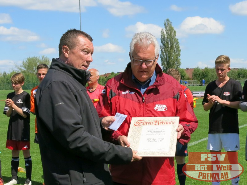 Eine weitere Ehrung erhielt der FSV im Anschluss an das Pokalspiel. Frank Fleske vom Fußballkreis Uckermark überreichte eine Ehrenurkunde und einen Scheck über 200 Euro an Schatzmeister Dieter Tack, als Anerkennung für die geleistete Arbeit für die Entwicklung des Vereinssports im Landkreis Uckermark.