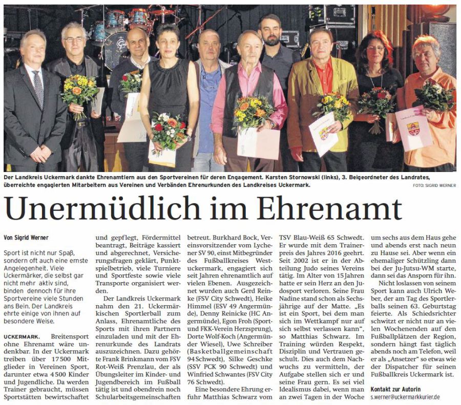 Auf dem 21. Sportlerball des Kreissportbundes der Uckermark wurden neben den Siegern der Sportlerumfrage auch die Arbeit einiger Ehrenamtler gewürdigt. Unter den Geehrten war auch unser Junioren-Trainer Frank Brinkmann.